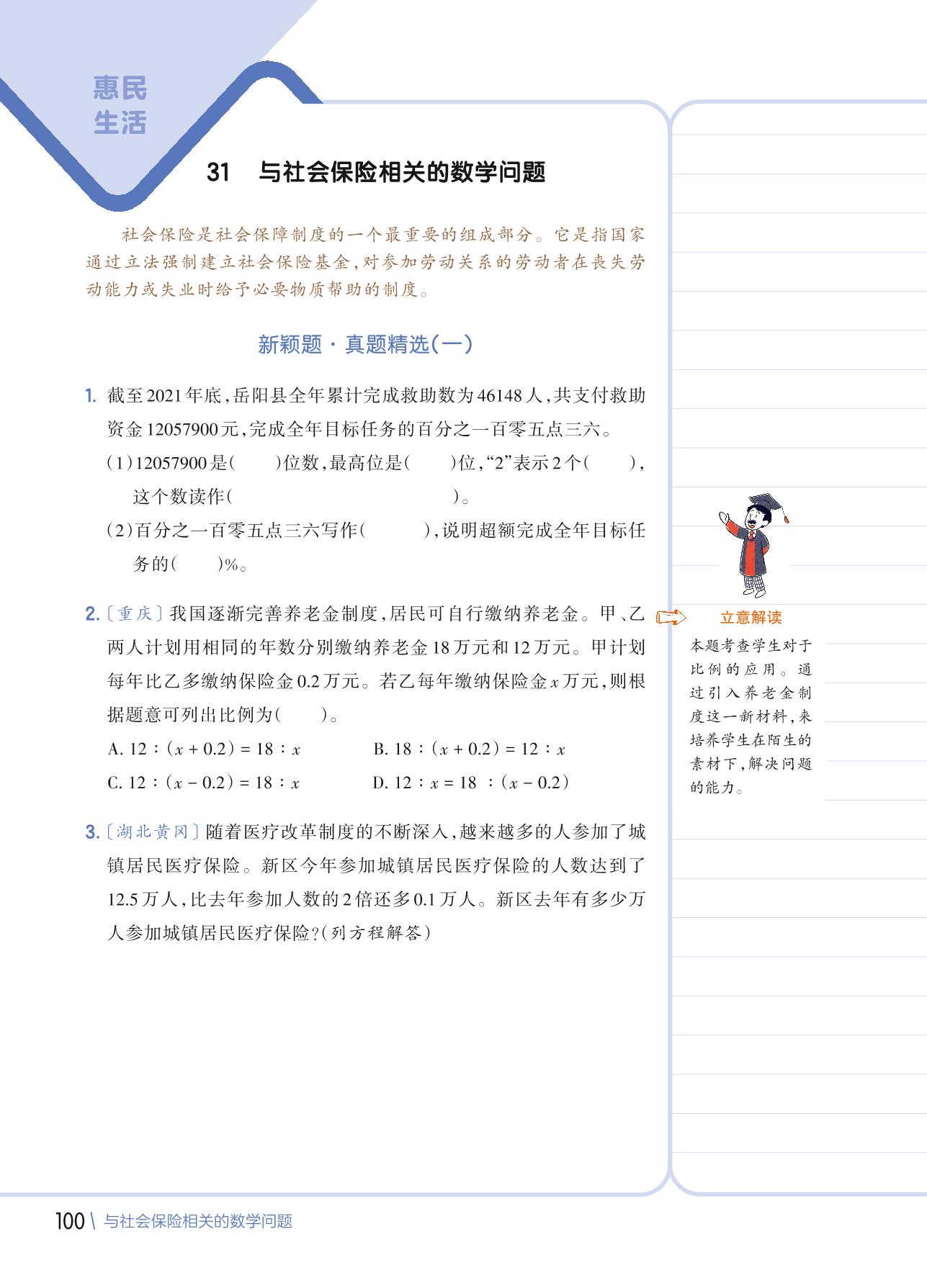 【2022版小学数学新颖题专练】热点话题九 惠民生活 31 与社会保险相关的数学问题