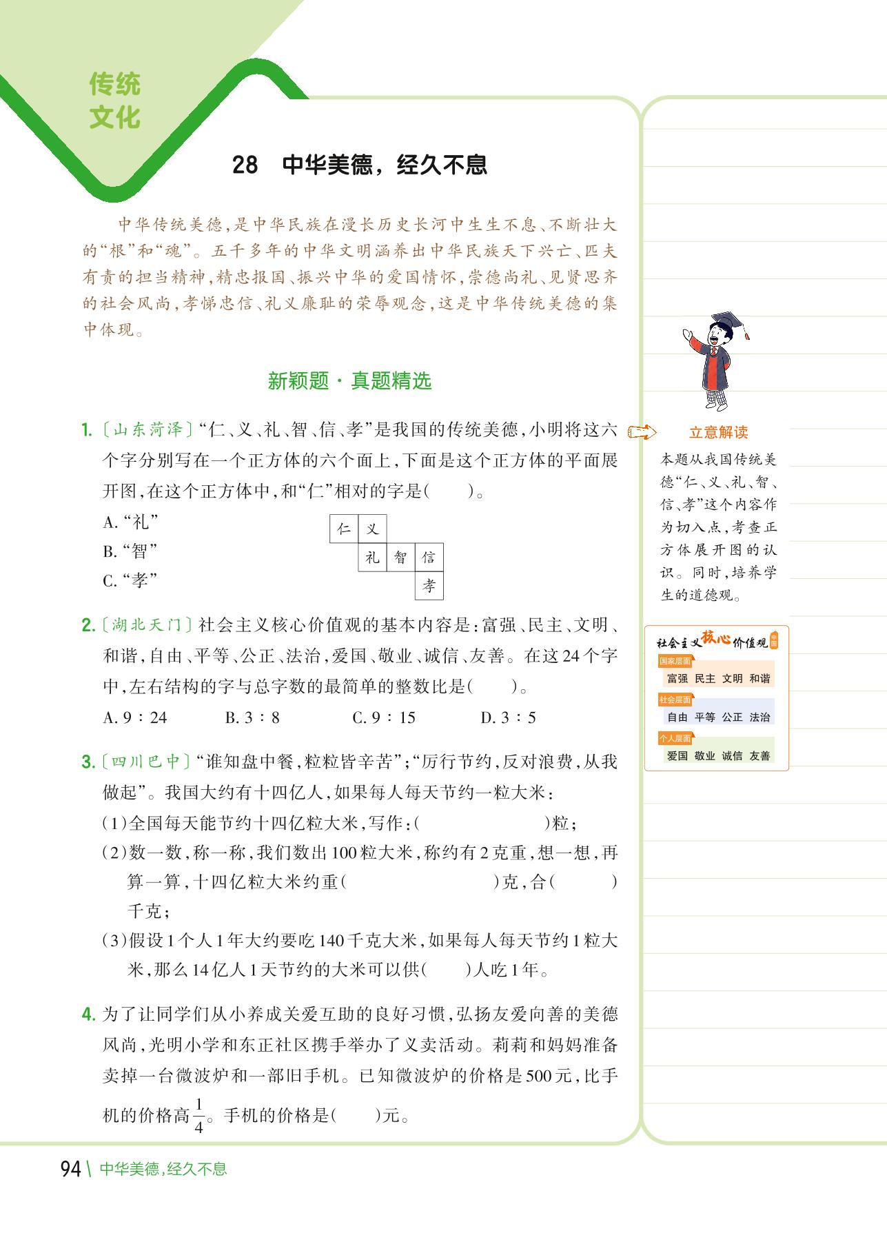 【2022版小学数学新颖题专练】热点话题八 传统文化 28 中华美德,经久不息
