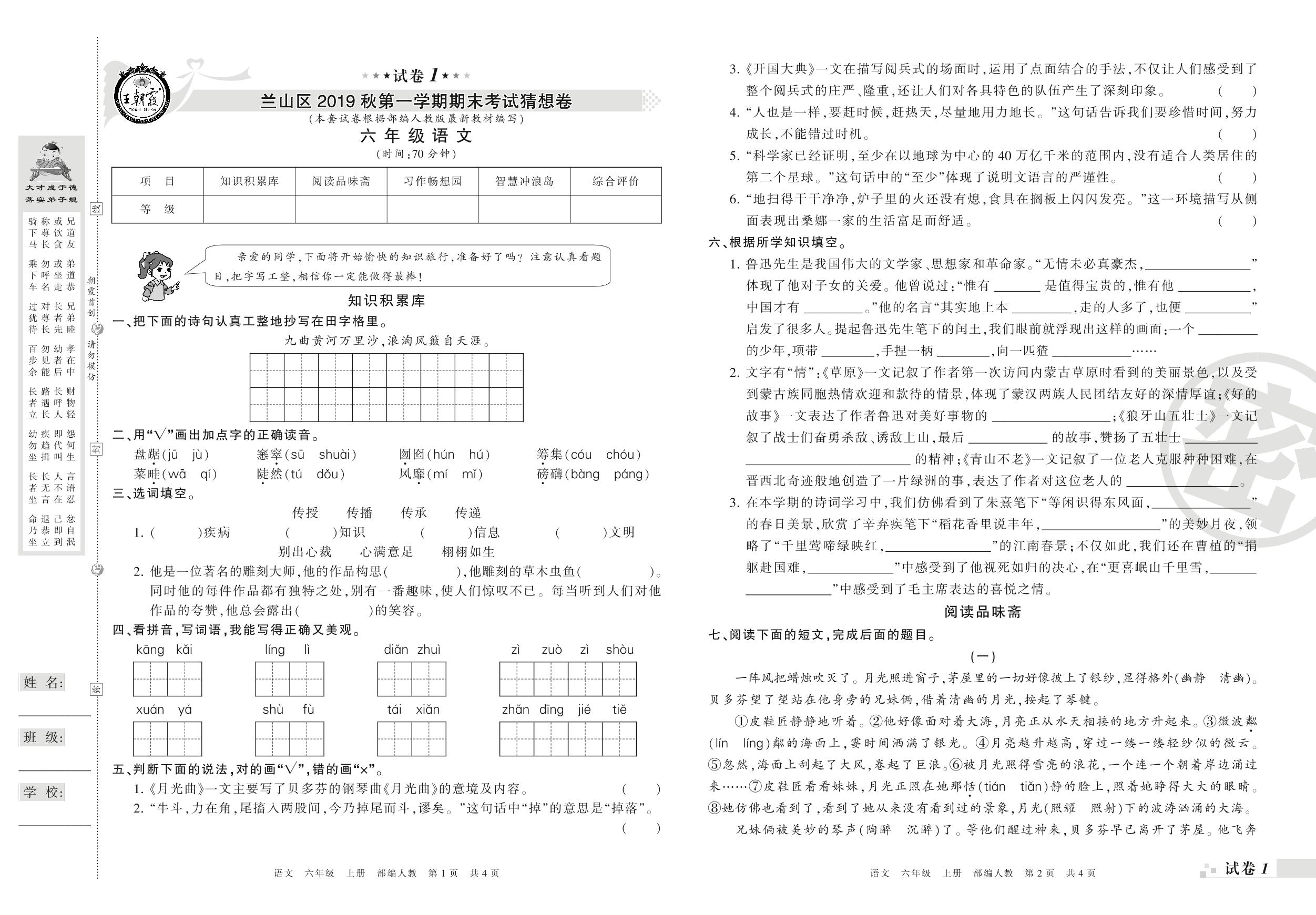 2019-2020学年第一学期临沂市兰山区猜想卷六年级语文试卷(人教版)【1】