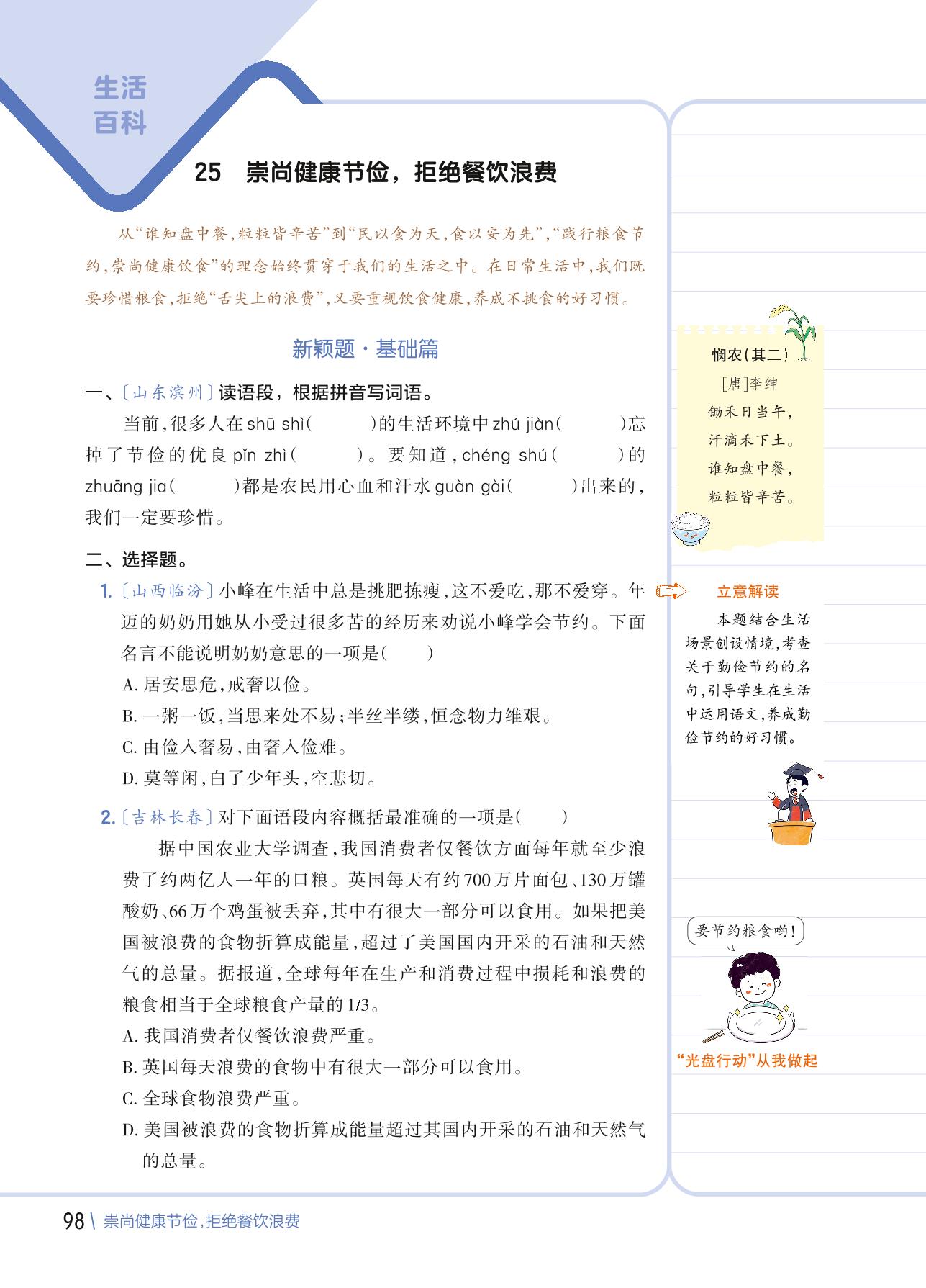 【2022版小学语文新颖题专练】热点话题九 生活百科 25 崇尚健康节俭,拒绝餐饮浪费
