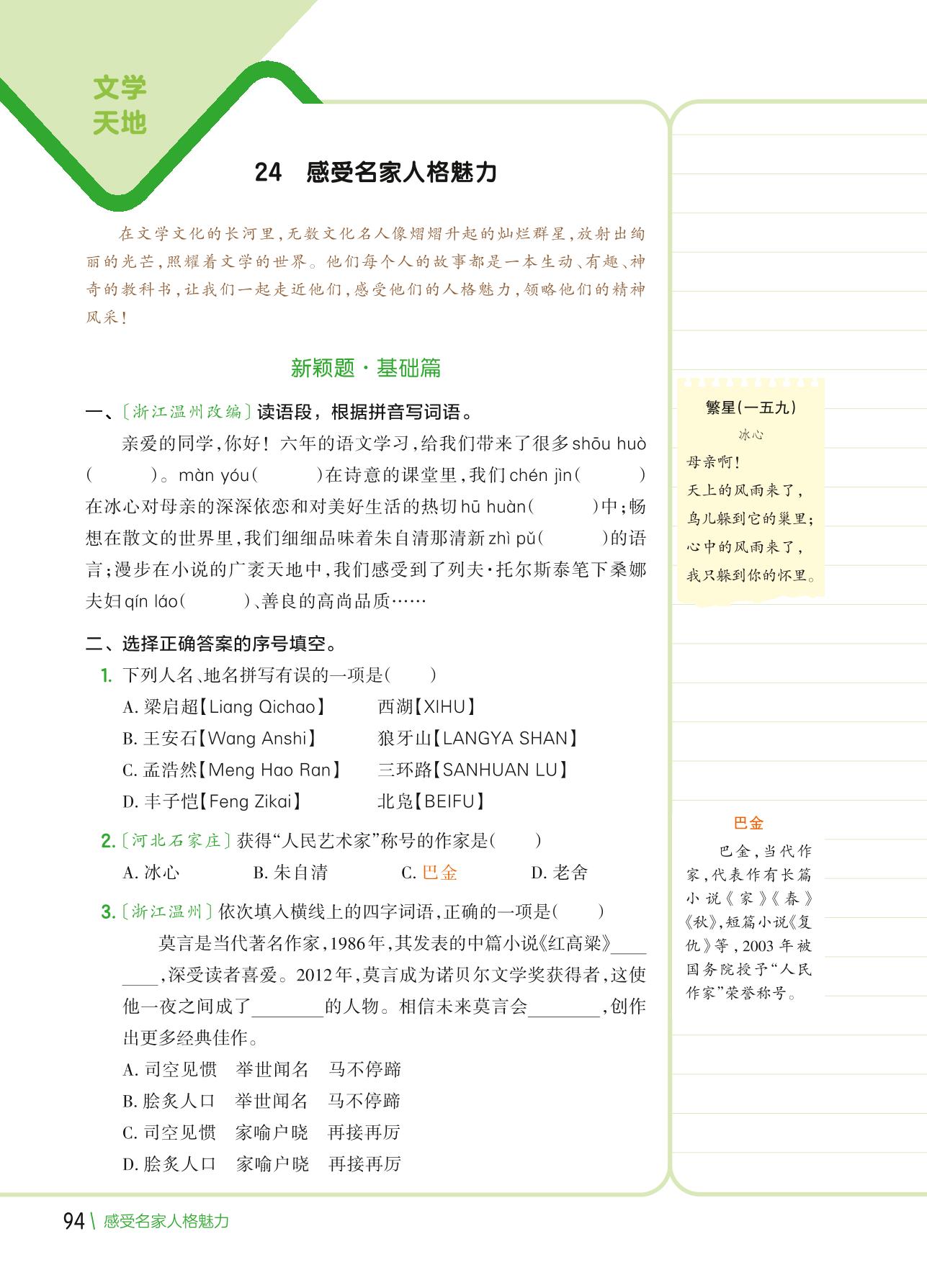 【2022版小学语文新颖题专练】热点话题八 文学天地 24 感受名家人格魅力
