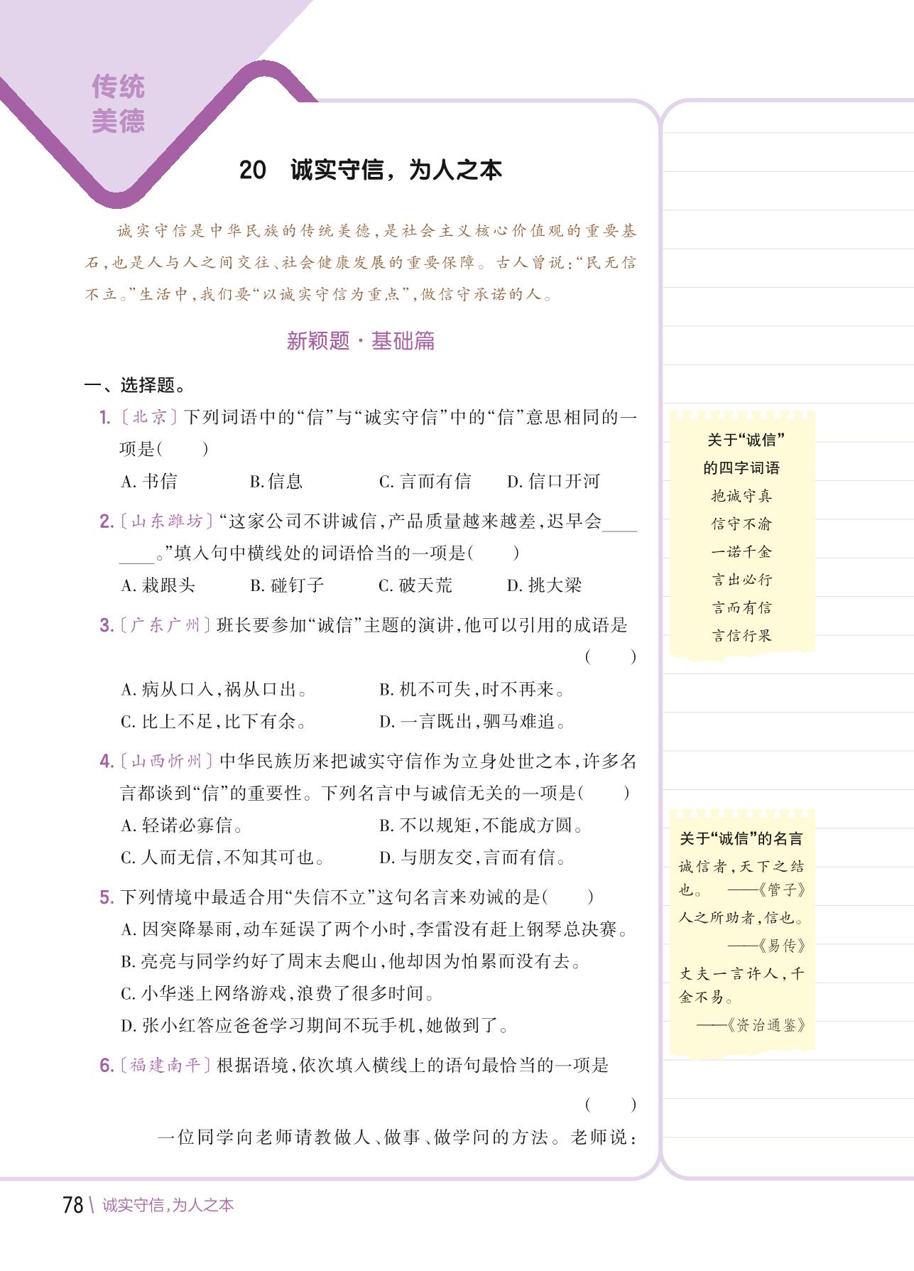 【2022版小学语文新颖题专练】热点话题七 传统美德 20 诚信守信,为人之本
