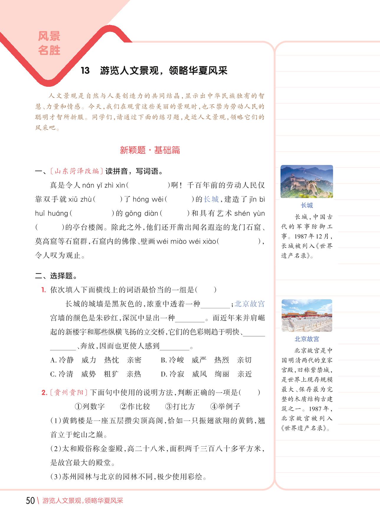 【2022版小学语文新颖题专练】热点话题五 风景名胜 13 游览人文景观,领略华夏风采