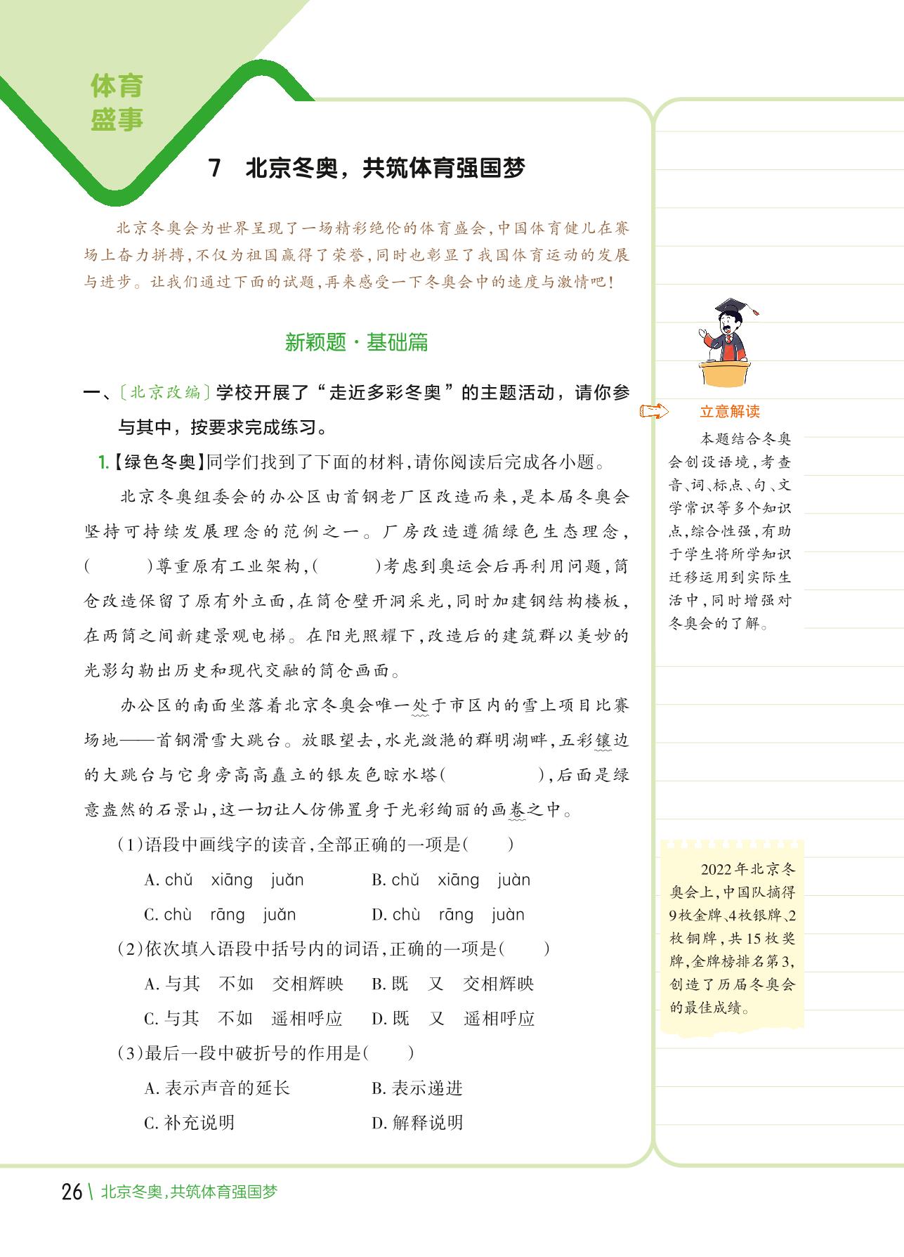 【2022版小学语文新颖题专练】热点话题三 体育盛事 7 北京冬奥,共筑体育强国梦