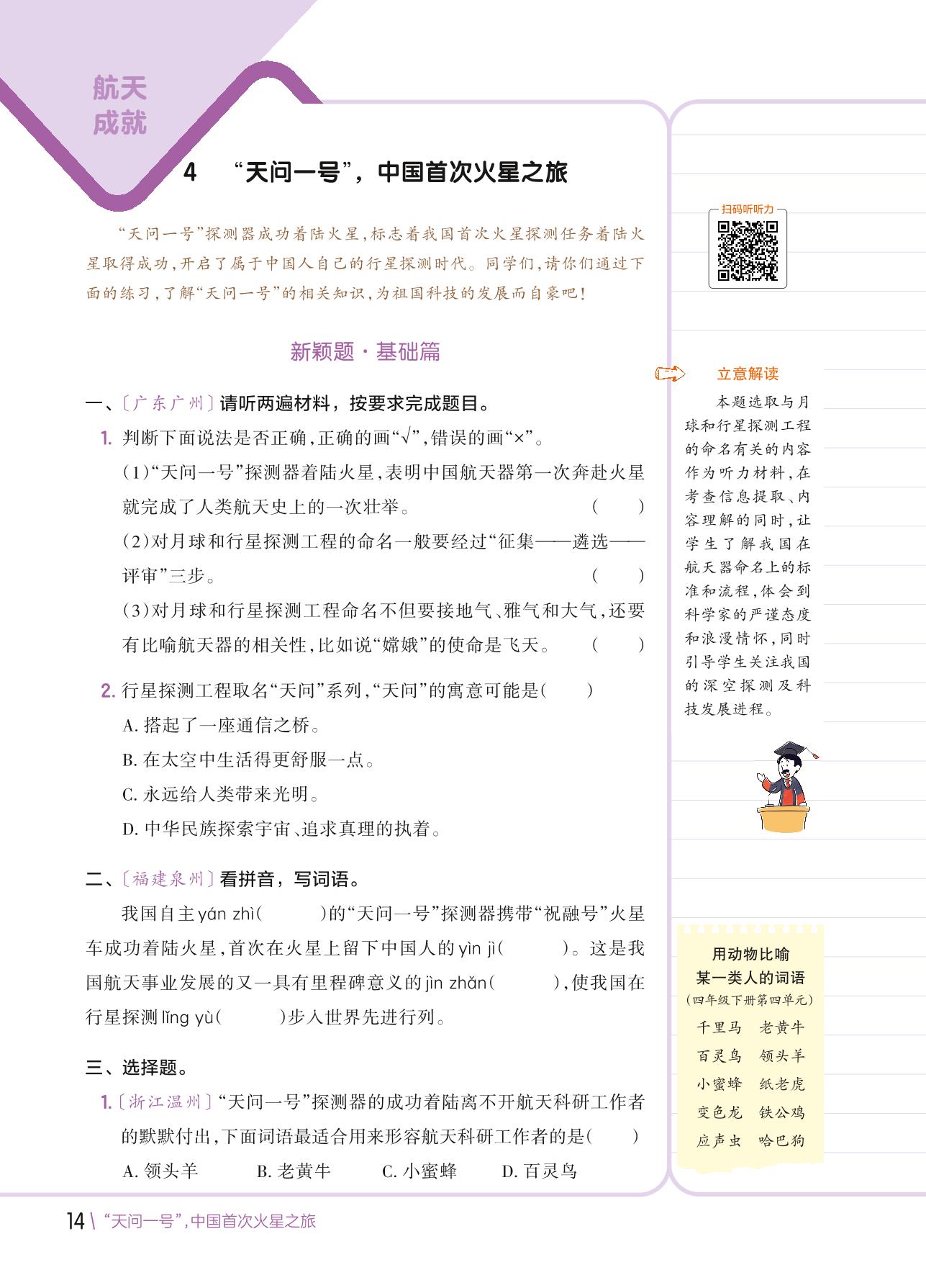 【2022版小学语文新颖题专练】热点话题二 航天成就 4 “天问一号”,中国首次火星之旅