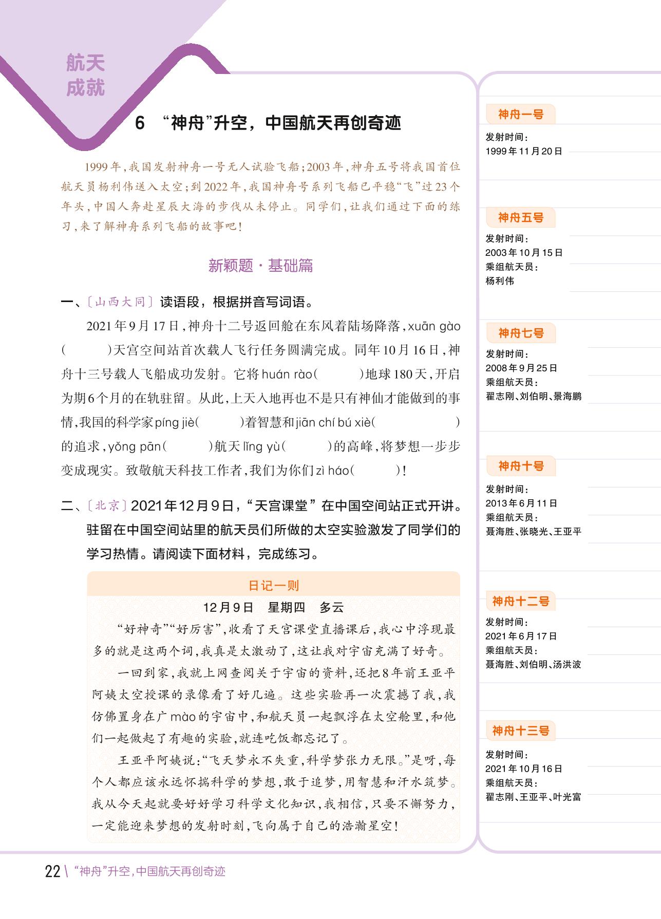 【2022版小学语文新颖题专练】热点话题二 航天成就 6 “神舟”升空,中国航天再创奇迹