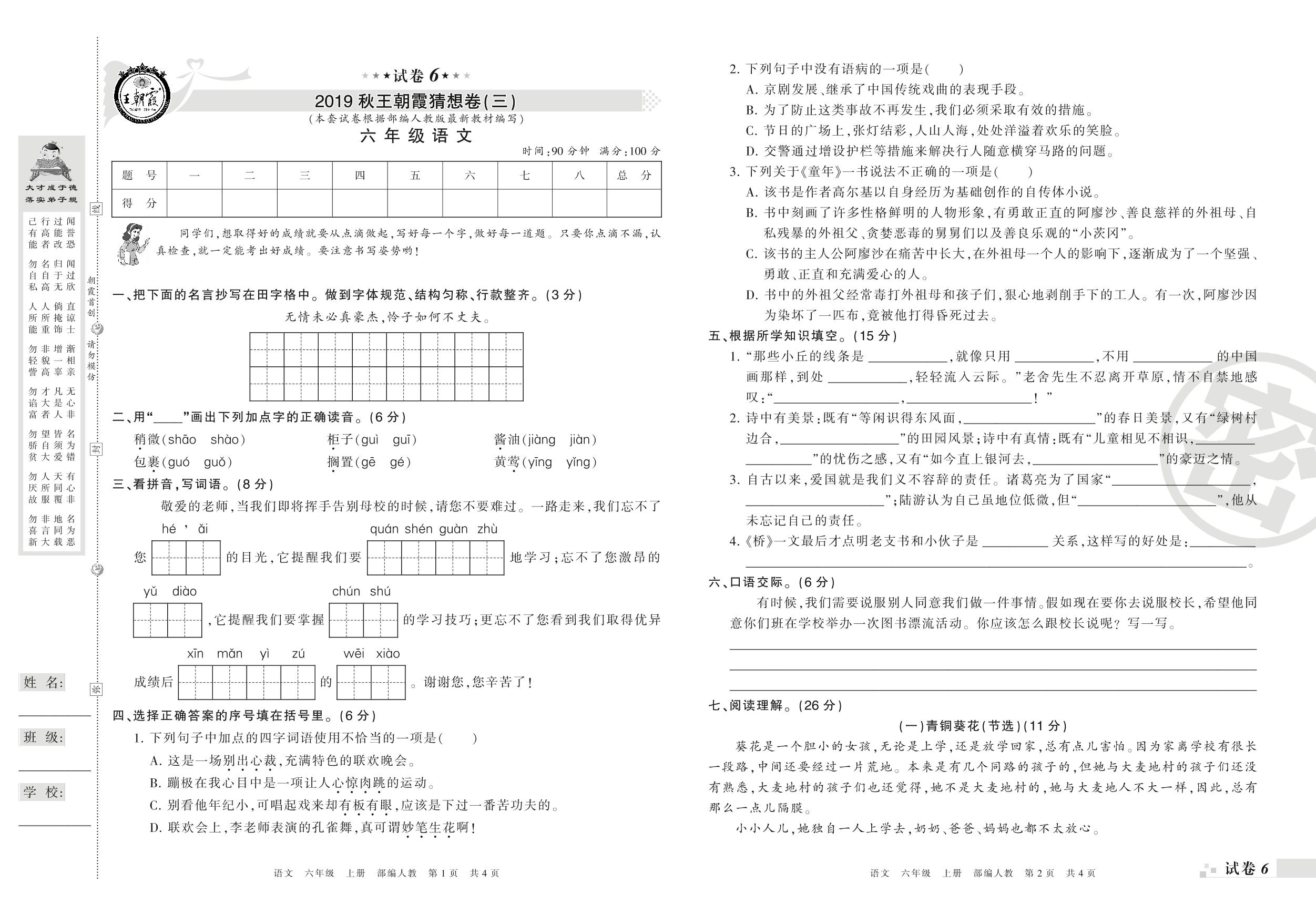 王朝霞期末猜想卷六年级上册语文(人教版)【6】