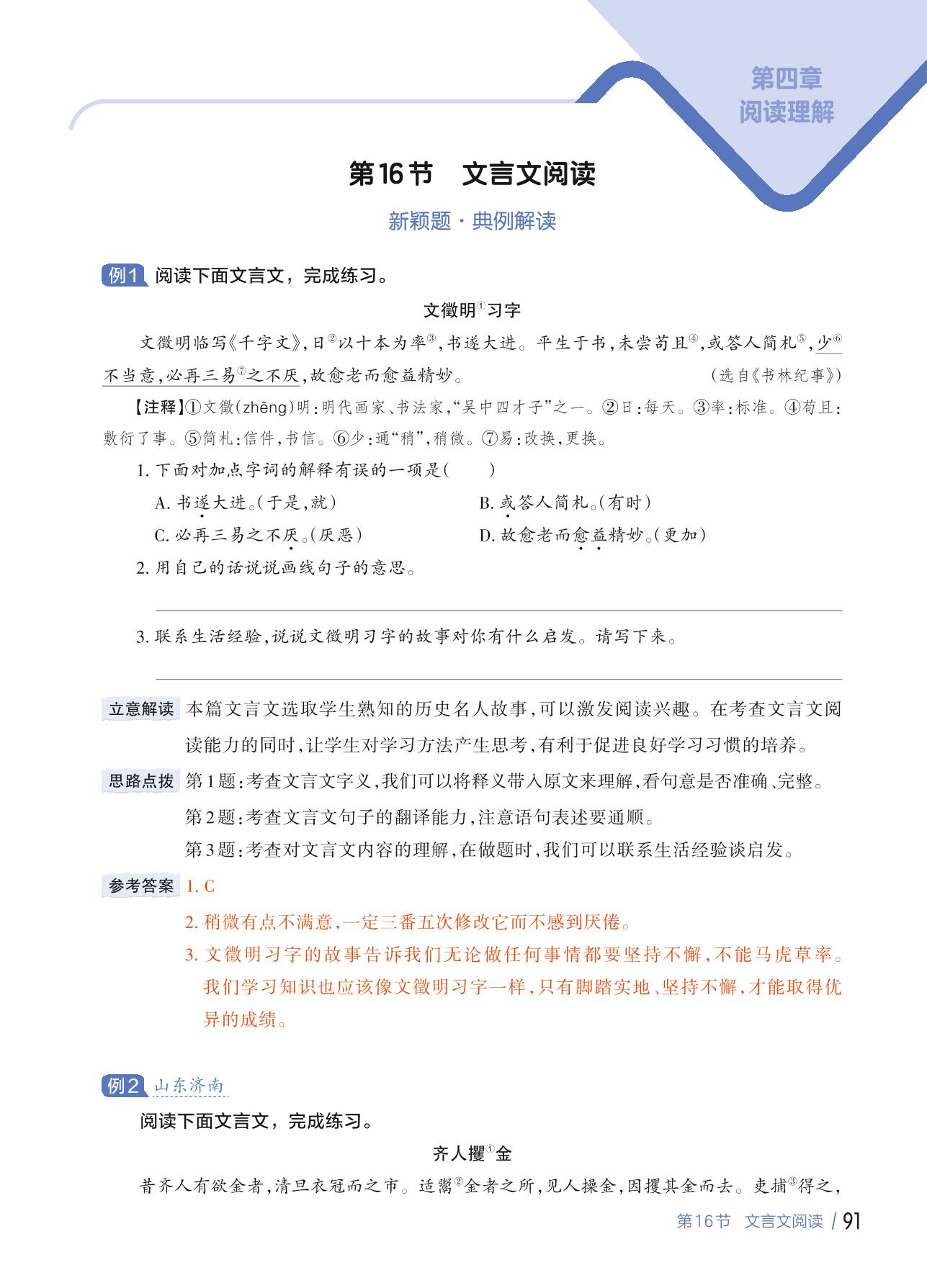 【2022版小学语文新颖题专练】专项知识点四 阅读理解 第16节 文言文阅读