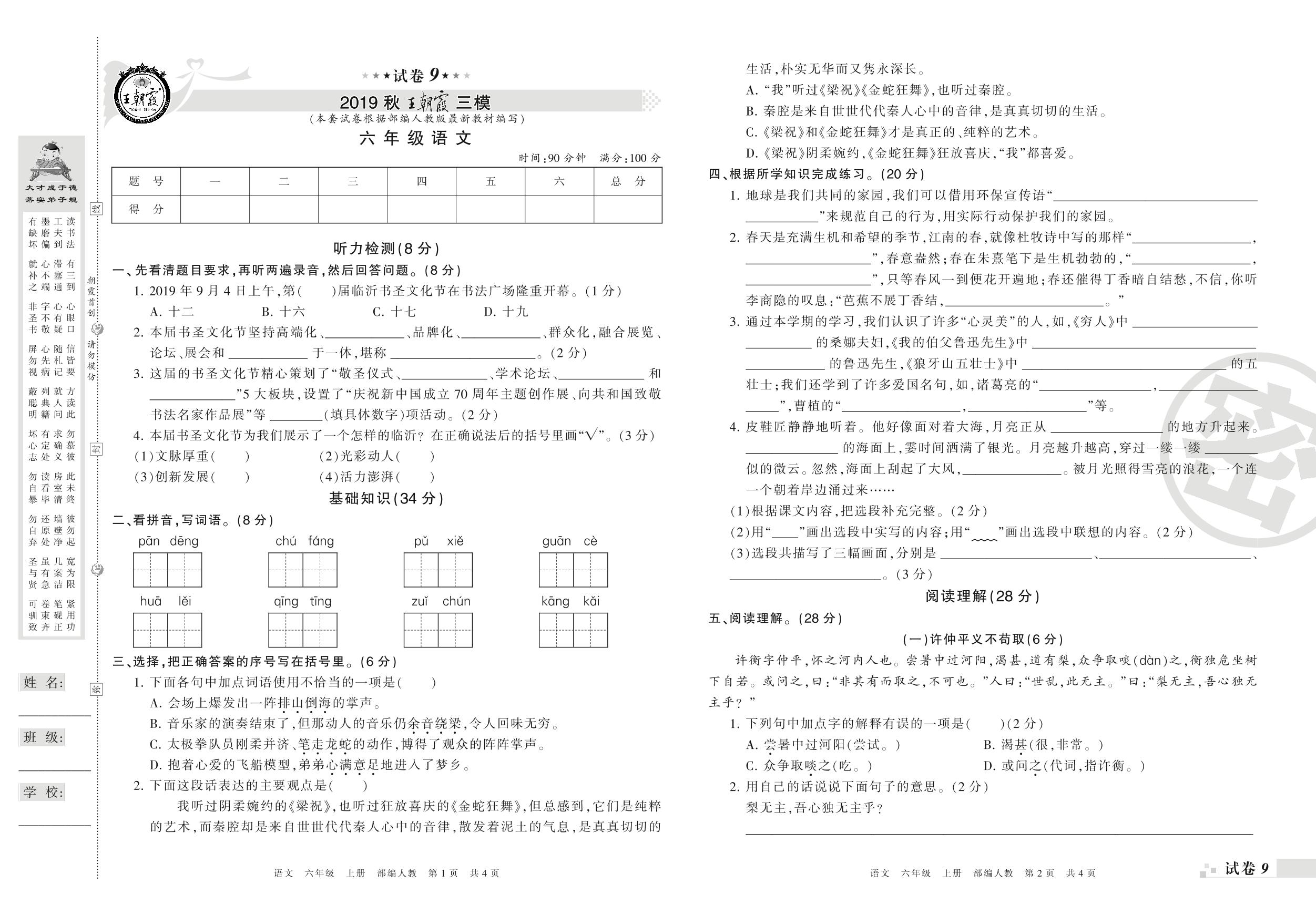 王朝霞期末模拟卷六年级上册语文(人教版)_R21080231906【9】