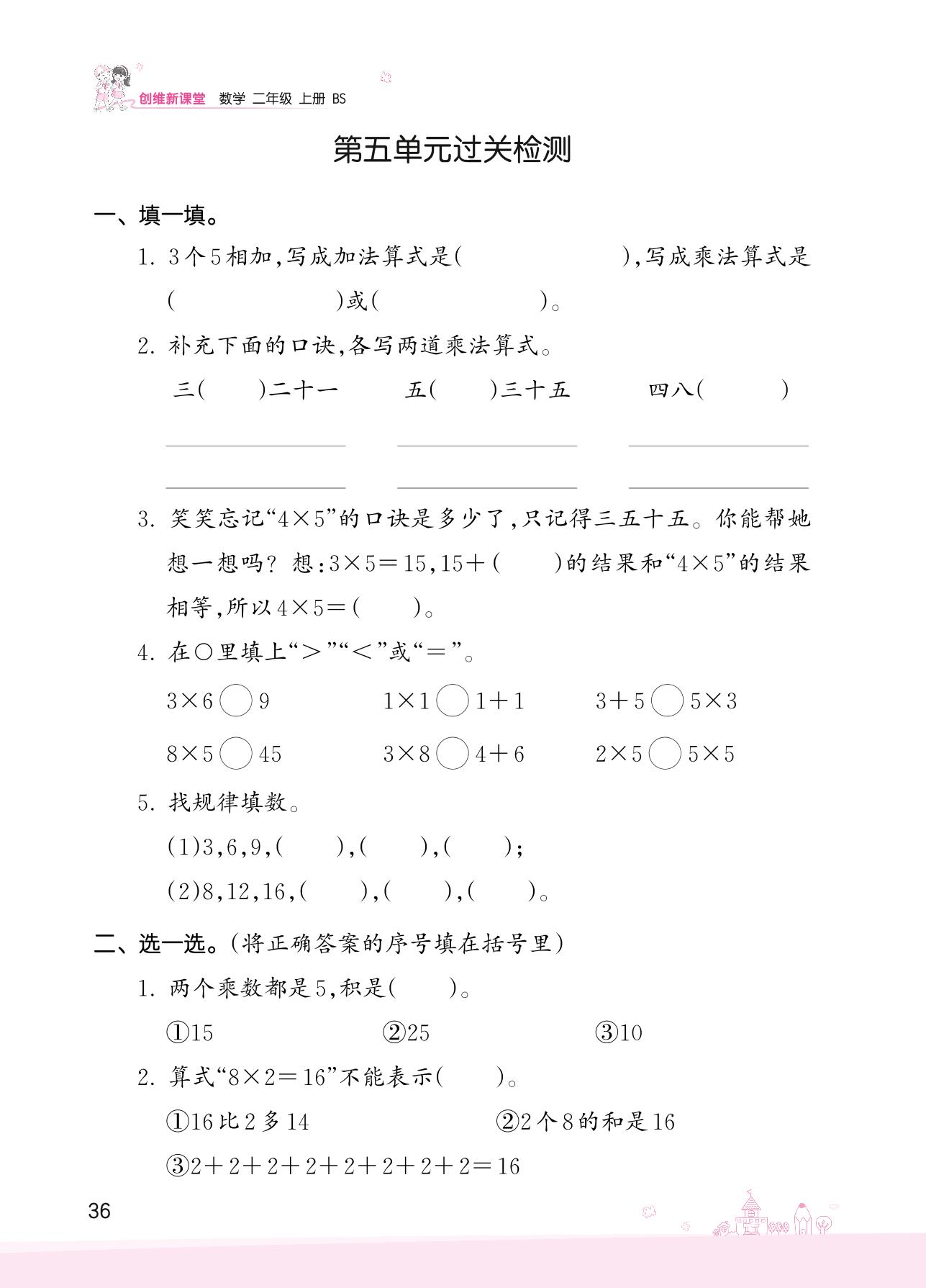 2022上册二年级数学北师版 五 2~13的乘法口诀——第五单元过关检测
