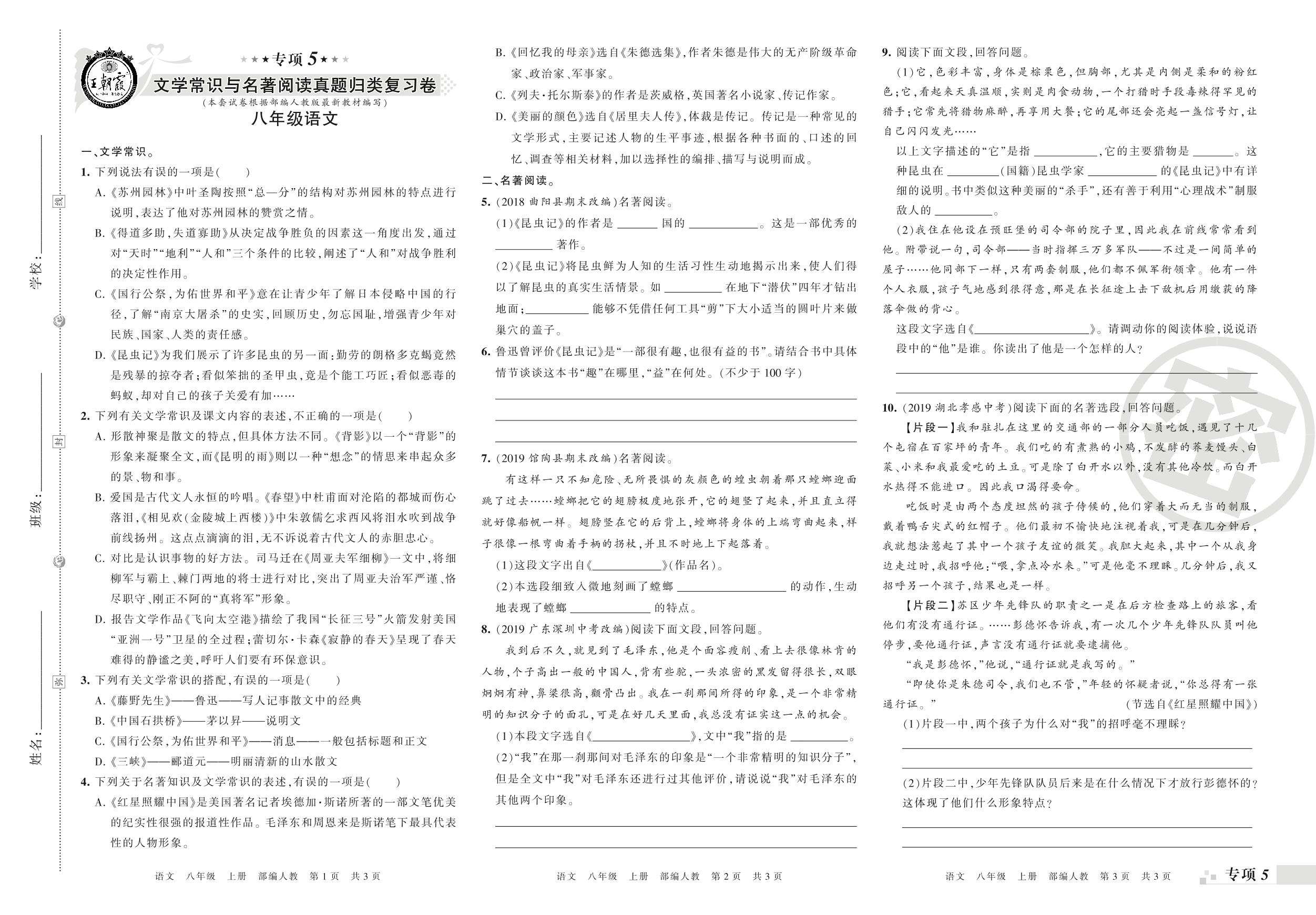 王朝霞期末专项卷——文学常识与名著阅读、口语交际与综合性学习真题归类复习八年级上册语文(人教版)_R21080231925【0】