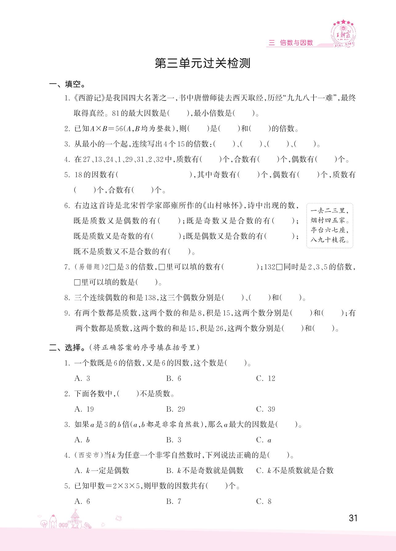 2022上册五年级数学北师版 三 倍数与因数——第三单元过关检测