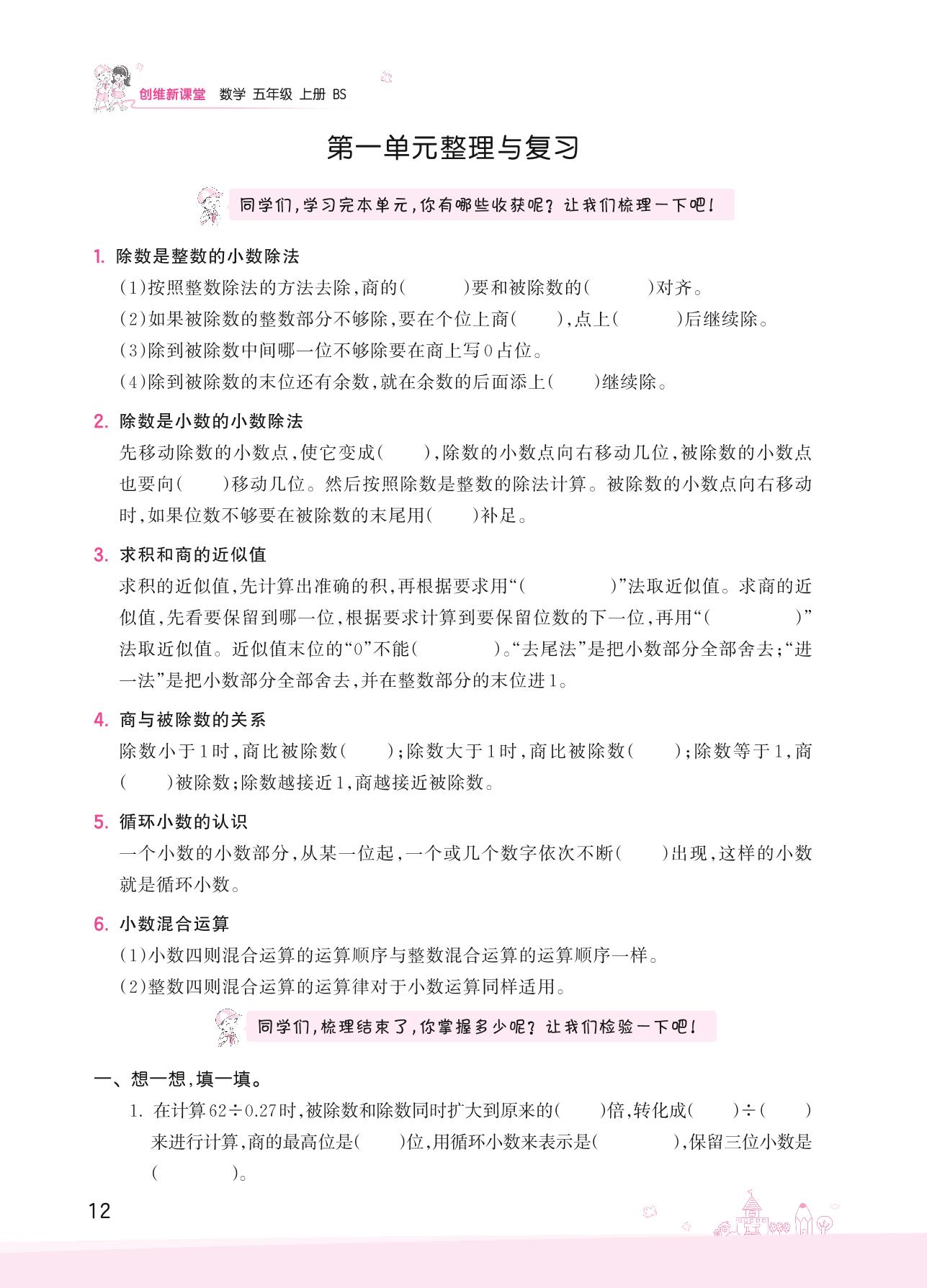 2022上册五年级数学北师版 一 小数除法——第一单元整理与复习