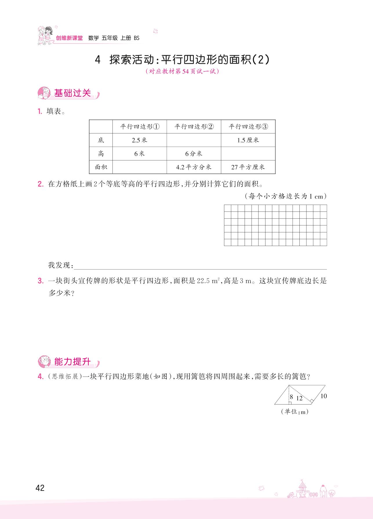 2022上册五年级数学北师版 四 多边形的面积——4 探索活动:平行四边形的面积(2)