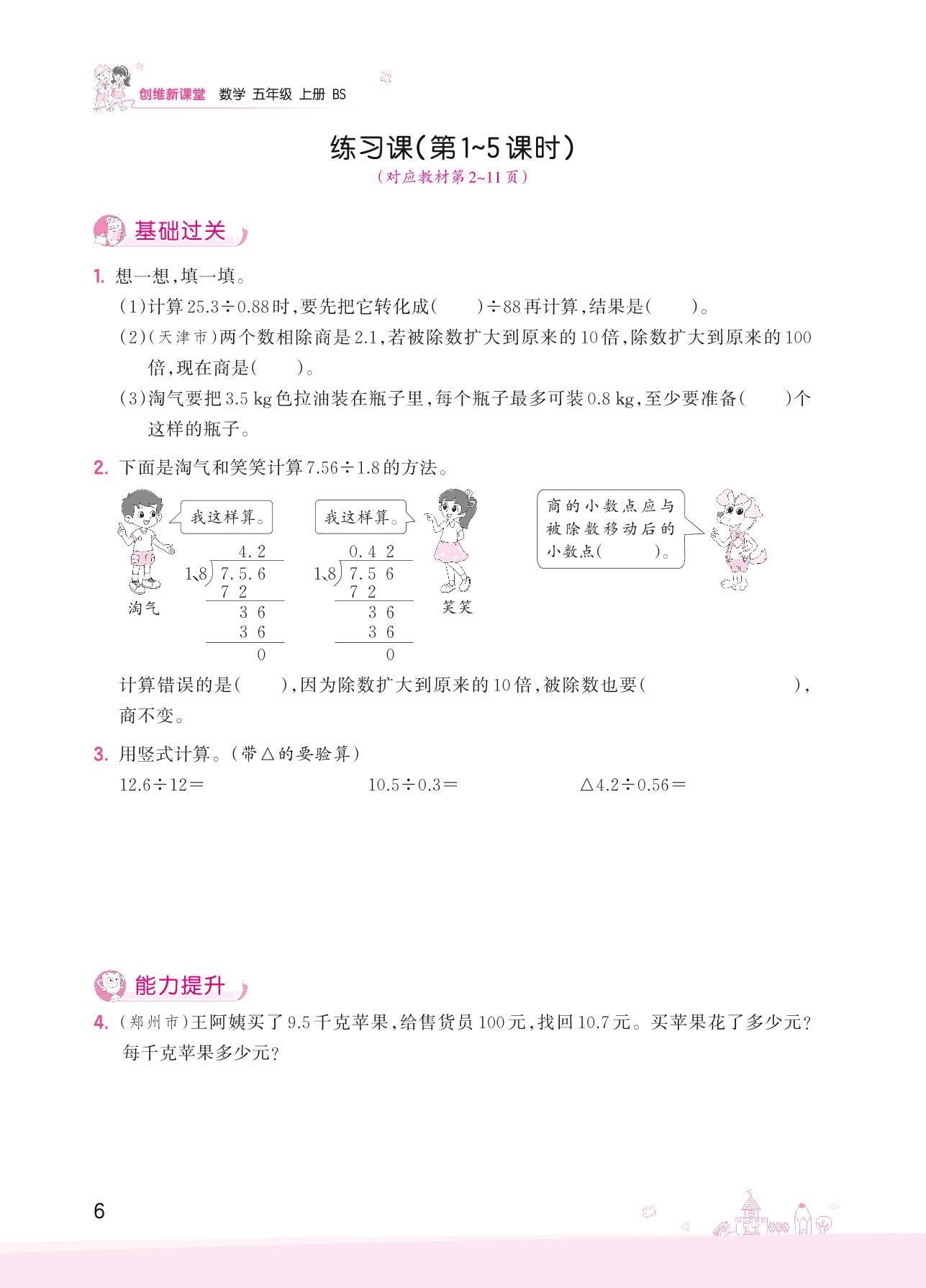2022上册五年级数学北师版 一 小数除法——练习课(第1~5课时)