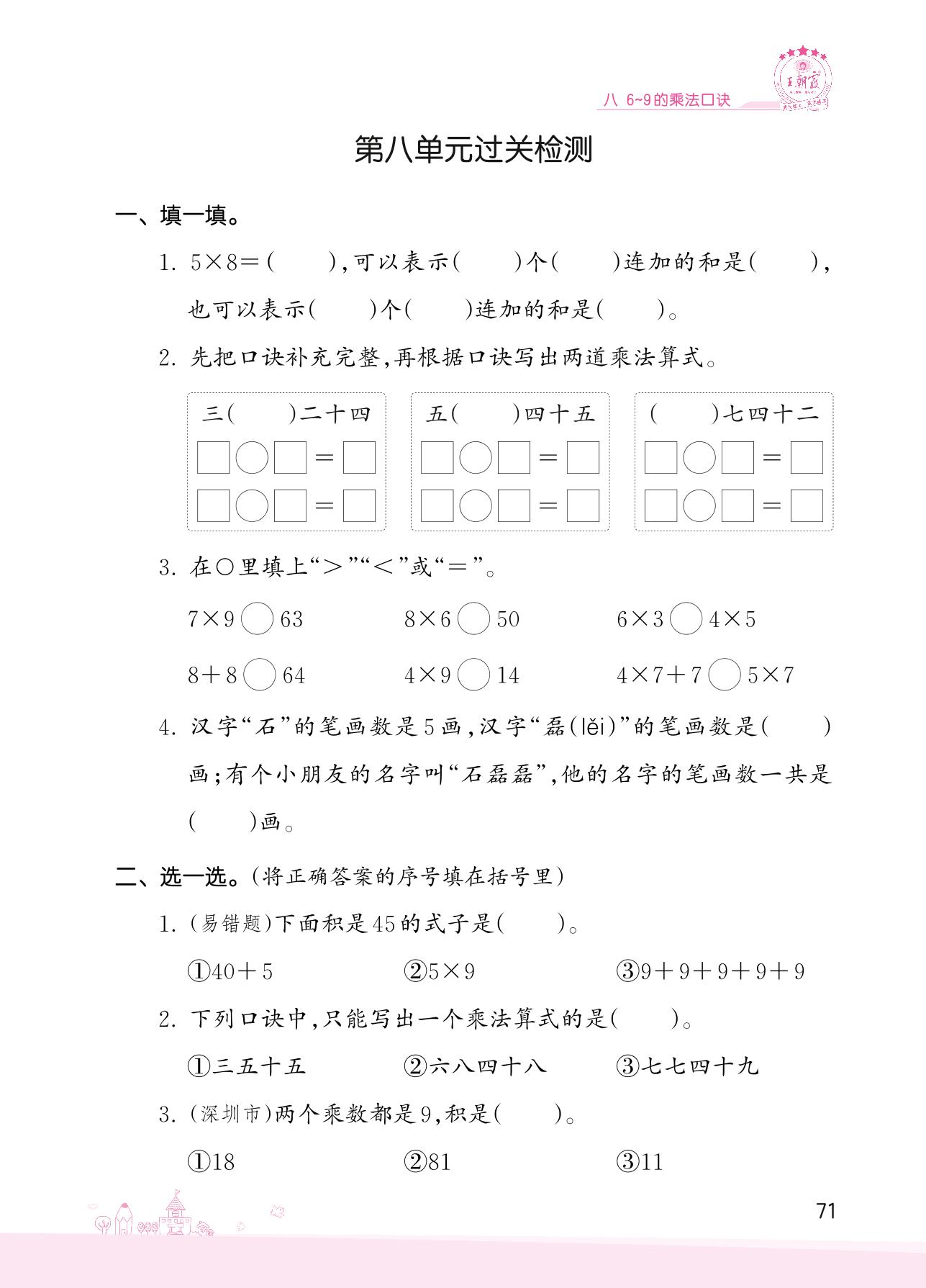 2022上册二年级数学北师版 八 6~9的乘法口诀——第八单元过关检测