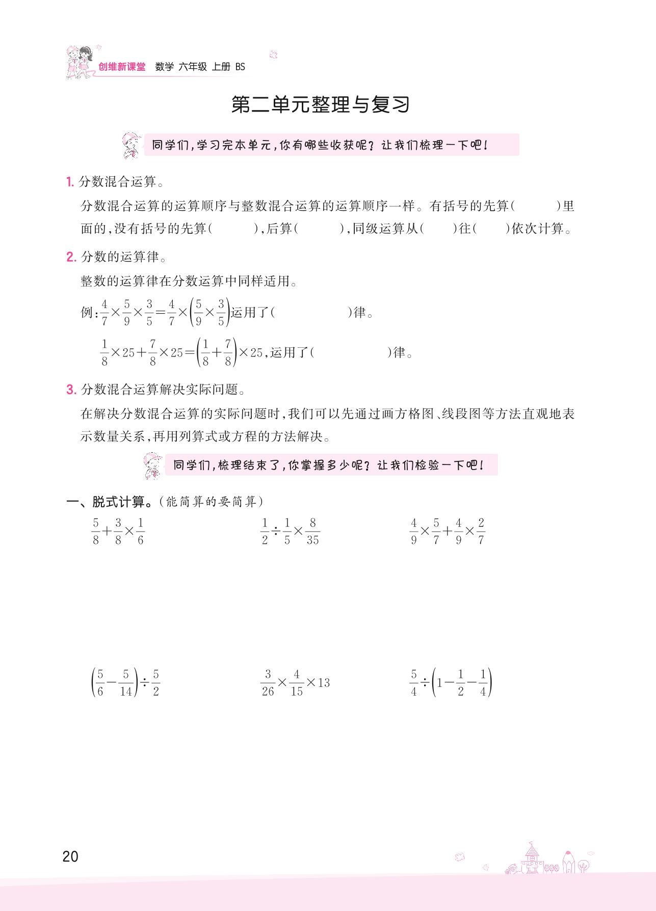 2022上册六年级数学北师版 二 分数混合运算——第二单元整理与复习
