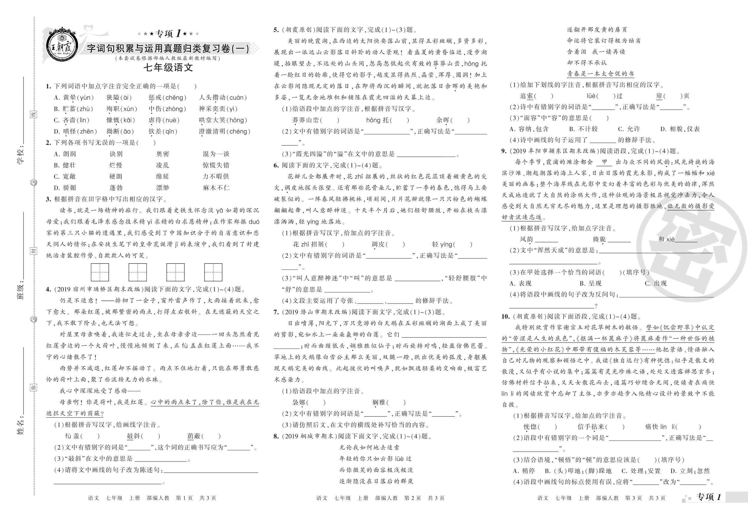 王朝霞期末专项卷——字词句积累与运用真题归类复习七年级上册语文(人教版)_R21080232122【0】