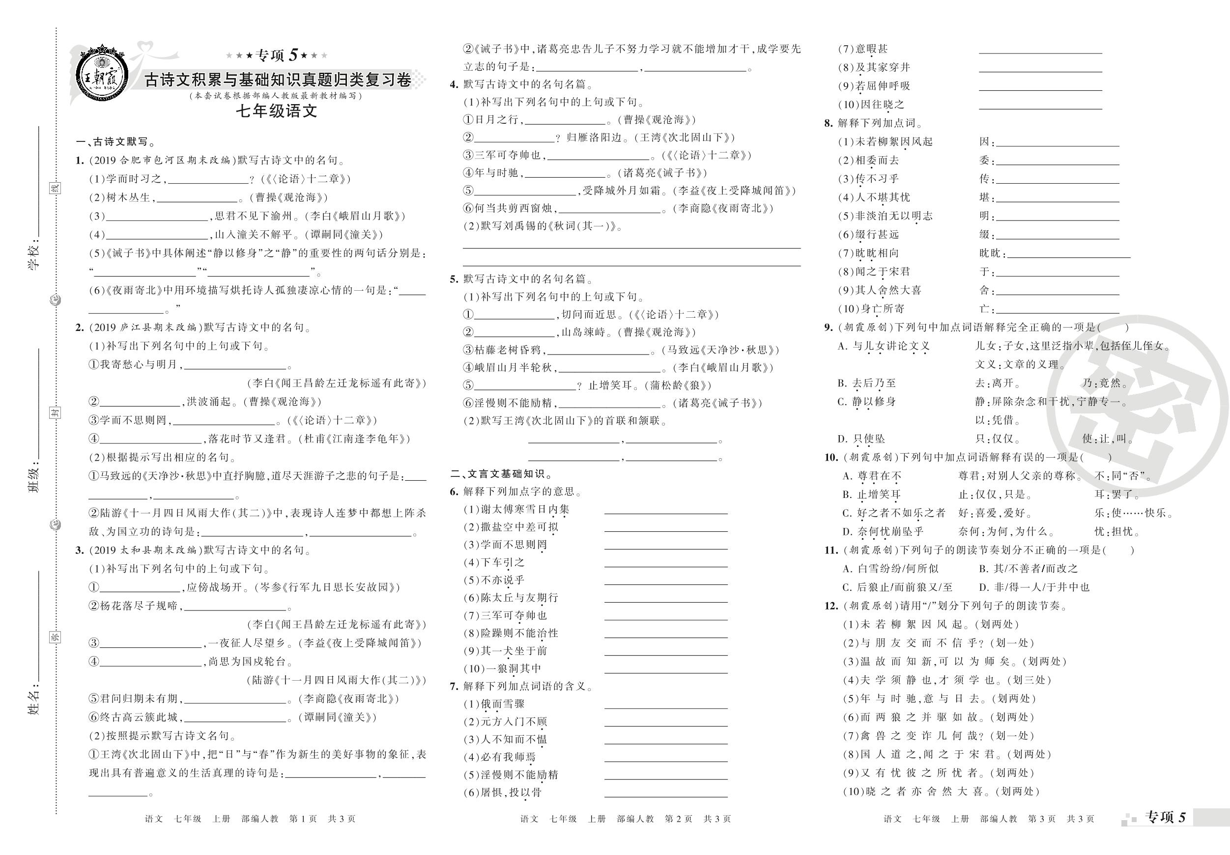 王朝霞期末专项卷——古诗文积累与基础知识、文言文阅读真题归类复习七年级上册语文(人教版)_R21080232140【0】