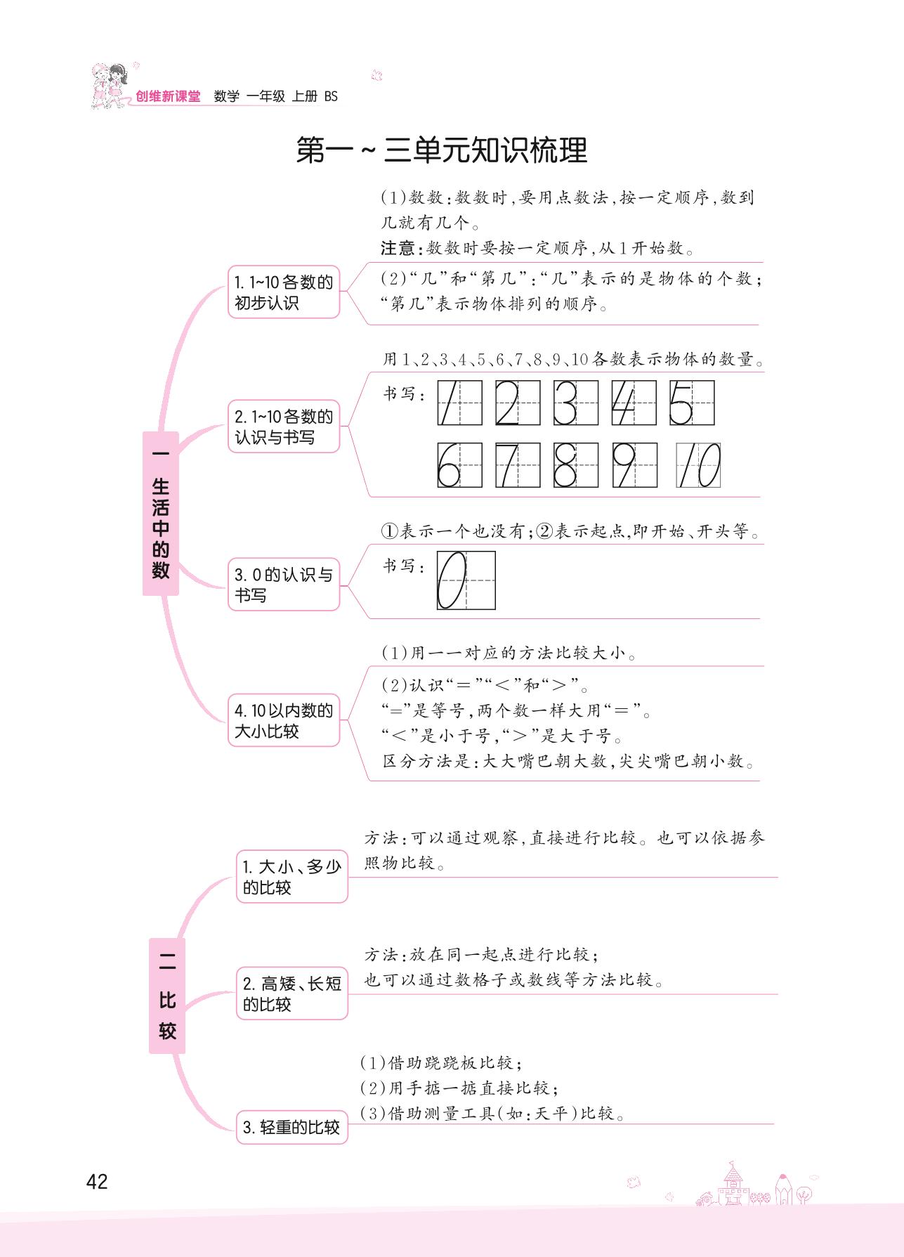 2022上册一年级数学北师版 第一~三单元知识梳理