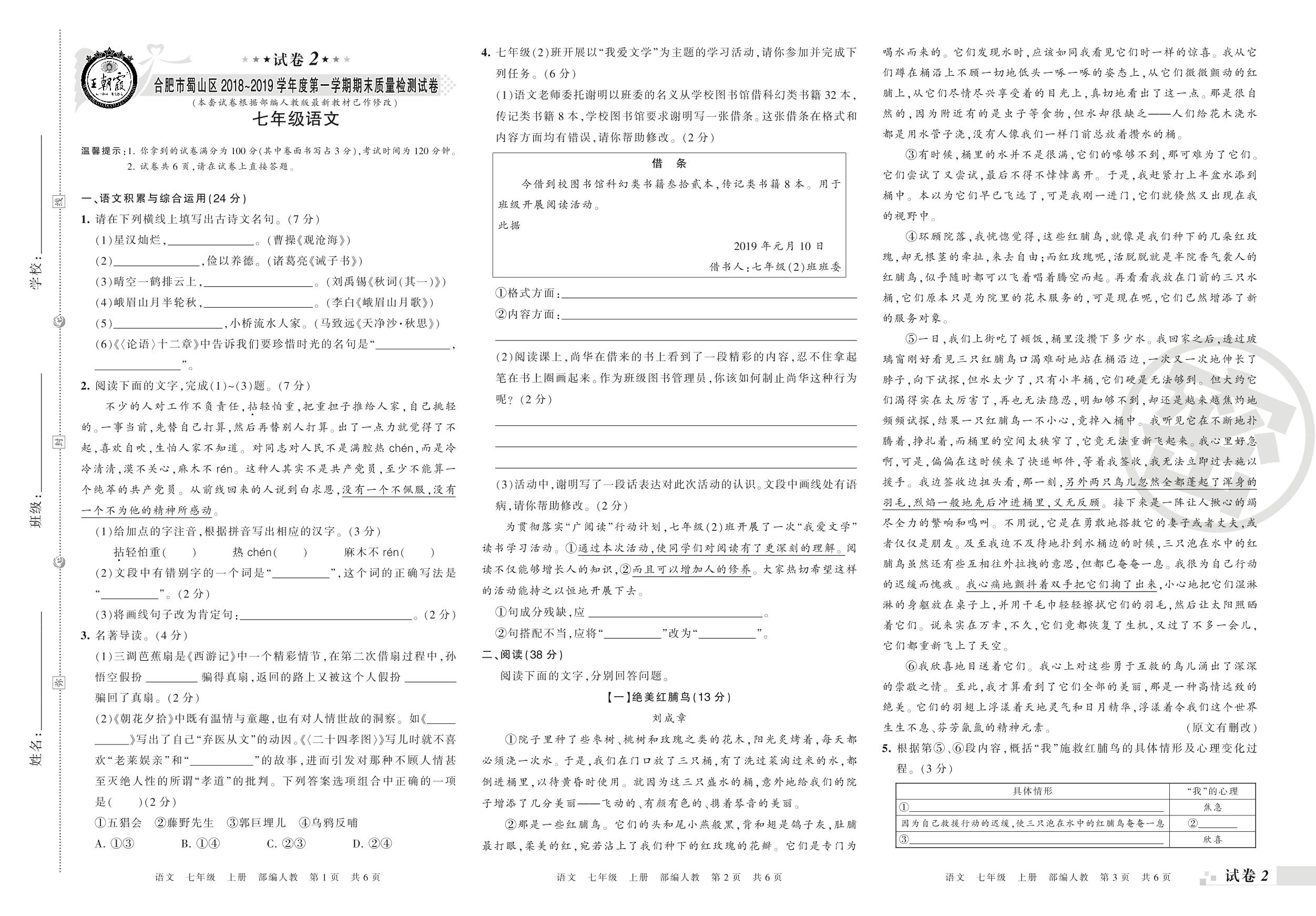 2018-2019学年第一学期合肥市蜀山区七年级语文试卷(人教版)【2】