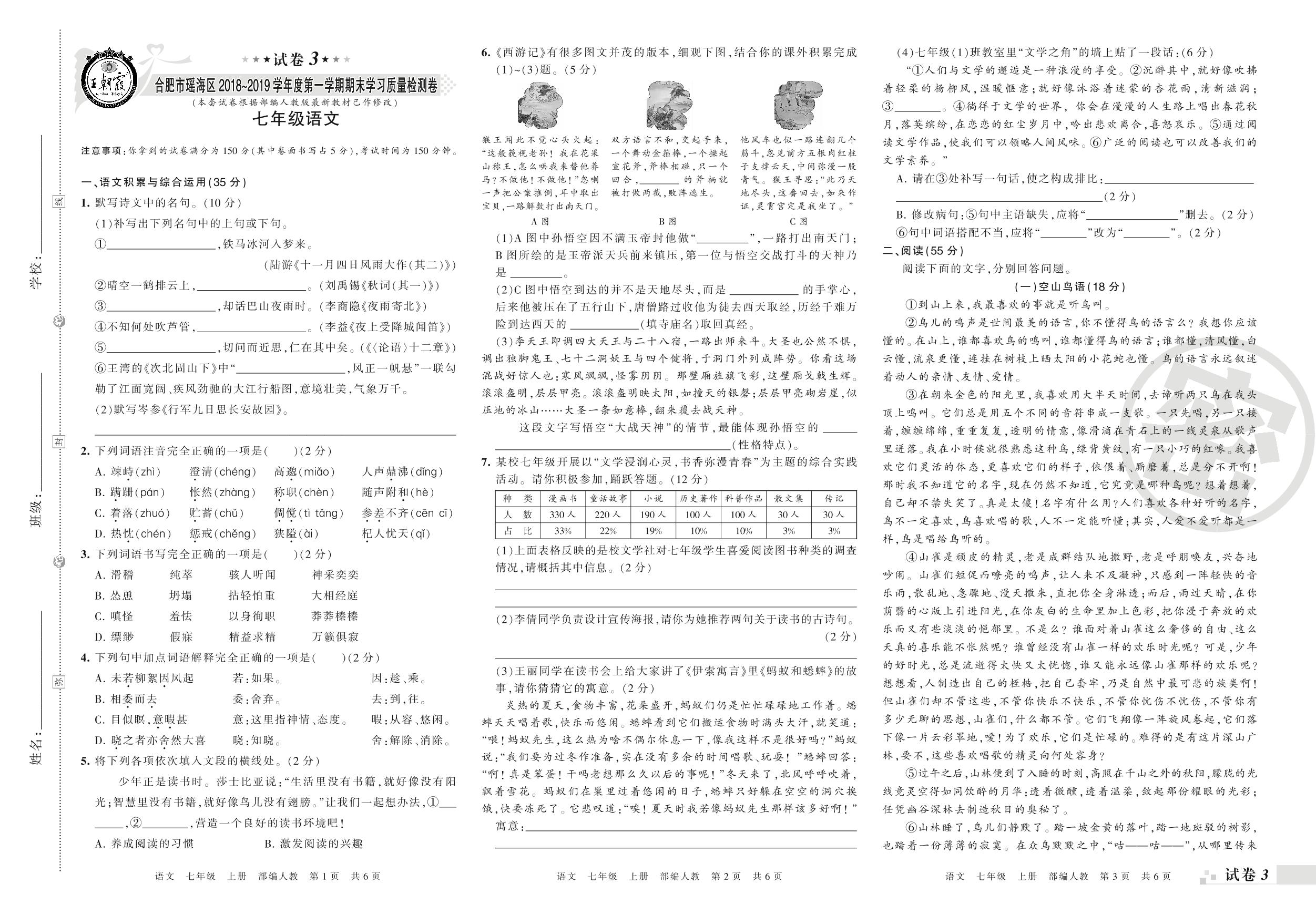 2018-2019学年第一学期合肥市瑶海区七年级语文试卷(人教版)【3】