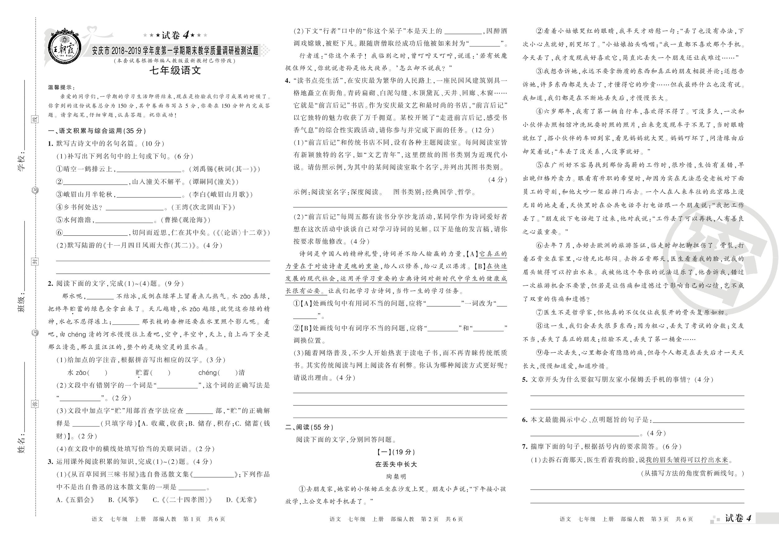 2018-2019学年第一学期安庆市七年级语文试卷(人教版)【4】