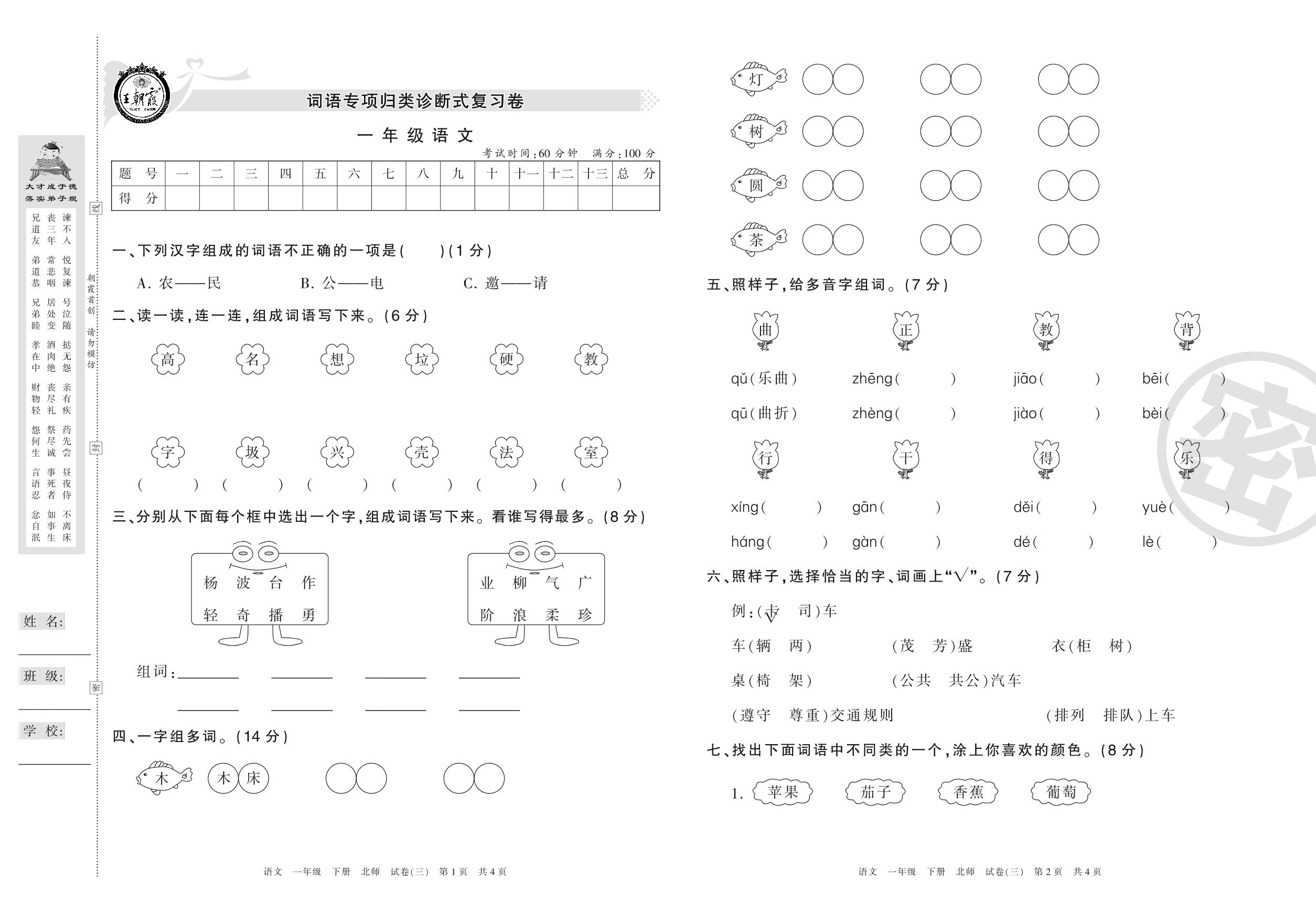 王朝霞期末专项卷一年级下册语文(北师版)_R210731183928【3】