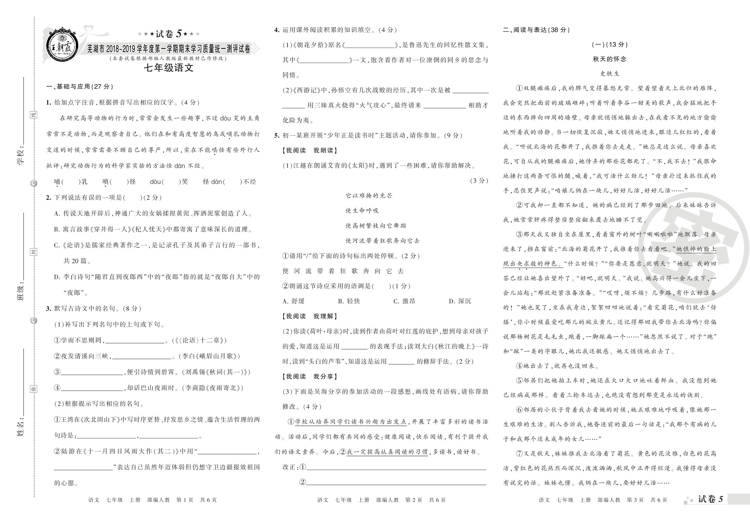 2018-2019学年第一学期芜湖市七年级语文试卷(人教版)【5】