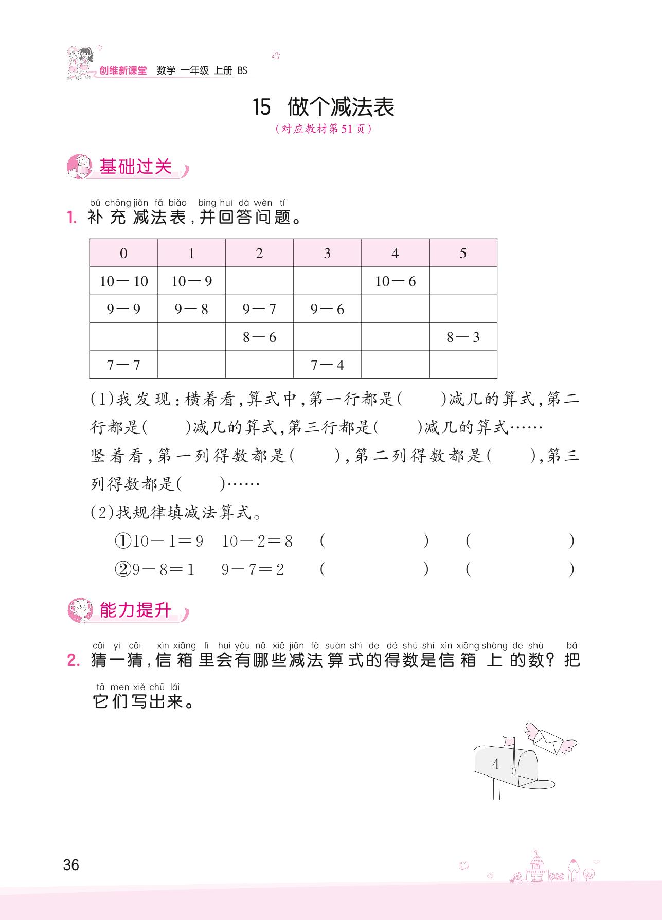 2022上册一年级数学北师版 三 加与减(一)——15 做个减法表
