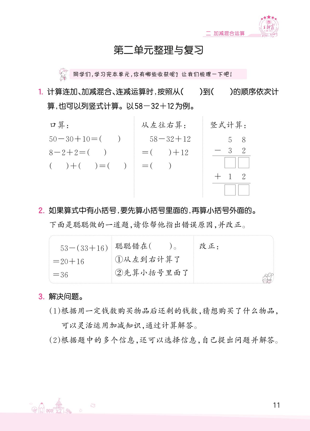 2022上册二年级数学冀教版 二 加减混合运算——第二单元整理与复习