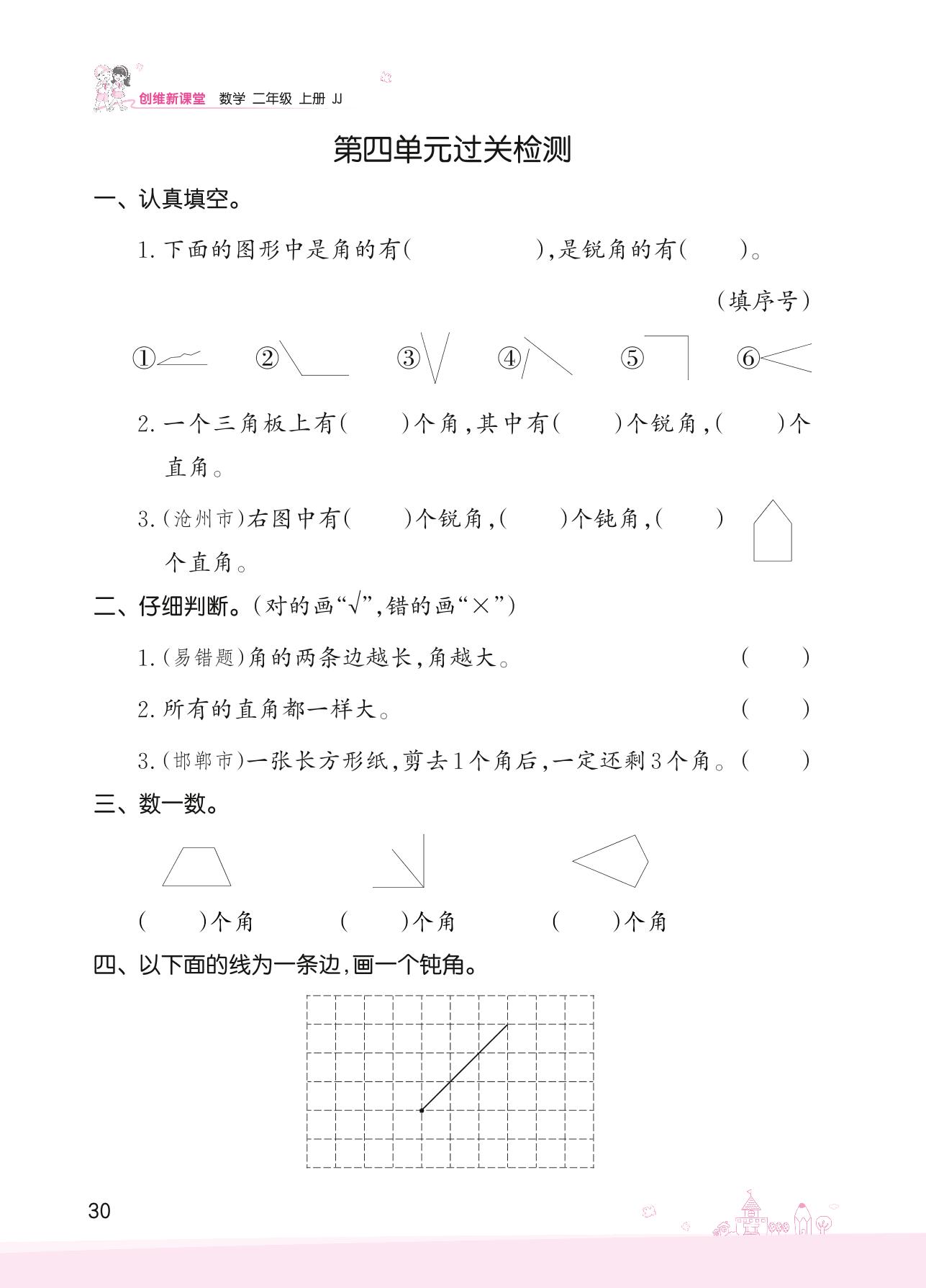 2022上册二年级数学冀教版 四 角的认识——第四单元过关检测