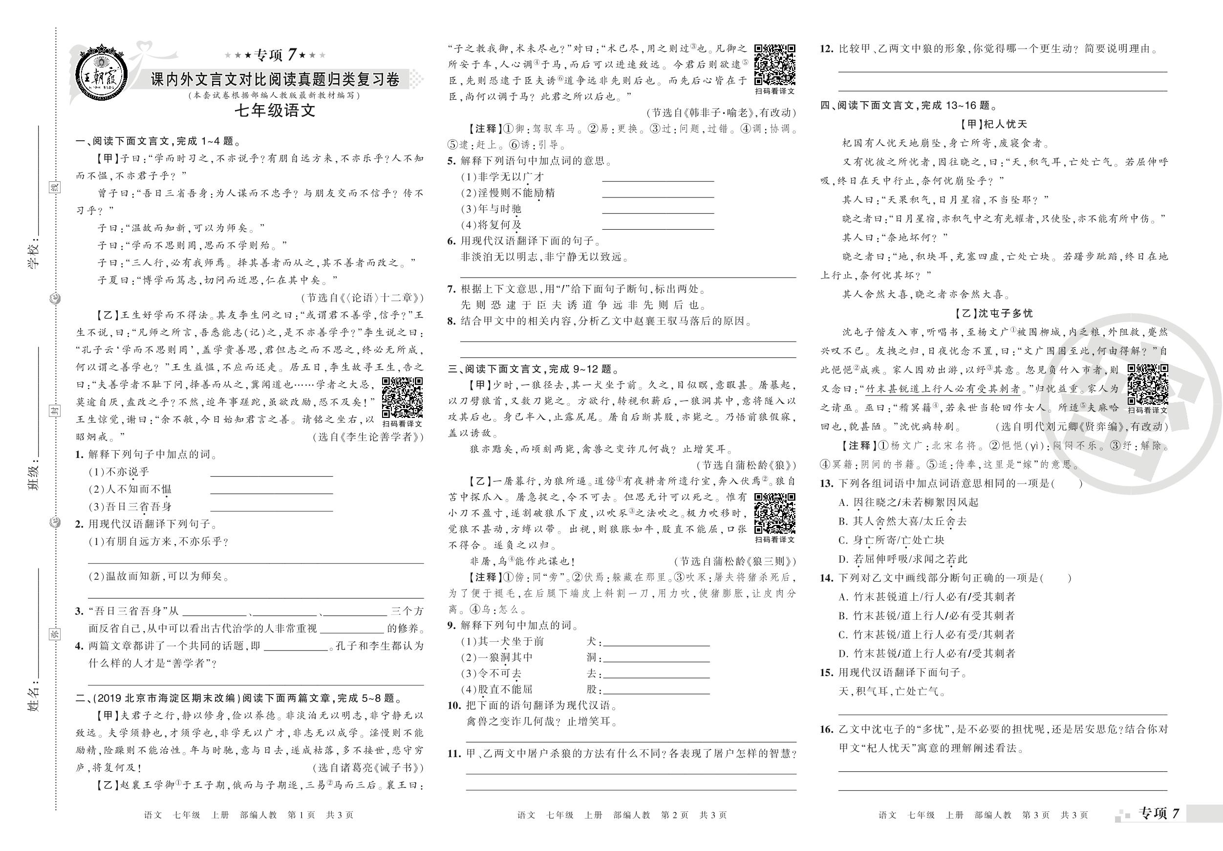 王朝霞期末专项卷——课内外文言文对比阅读、古诗词阅读真题归类复习七年级上册语文(人教版)_R21080232320【0】