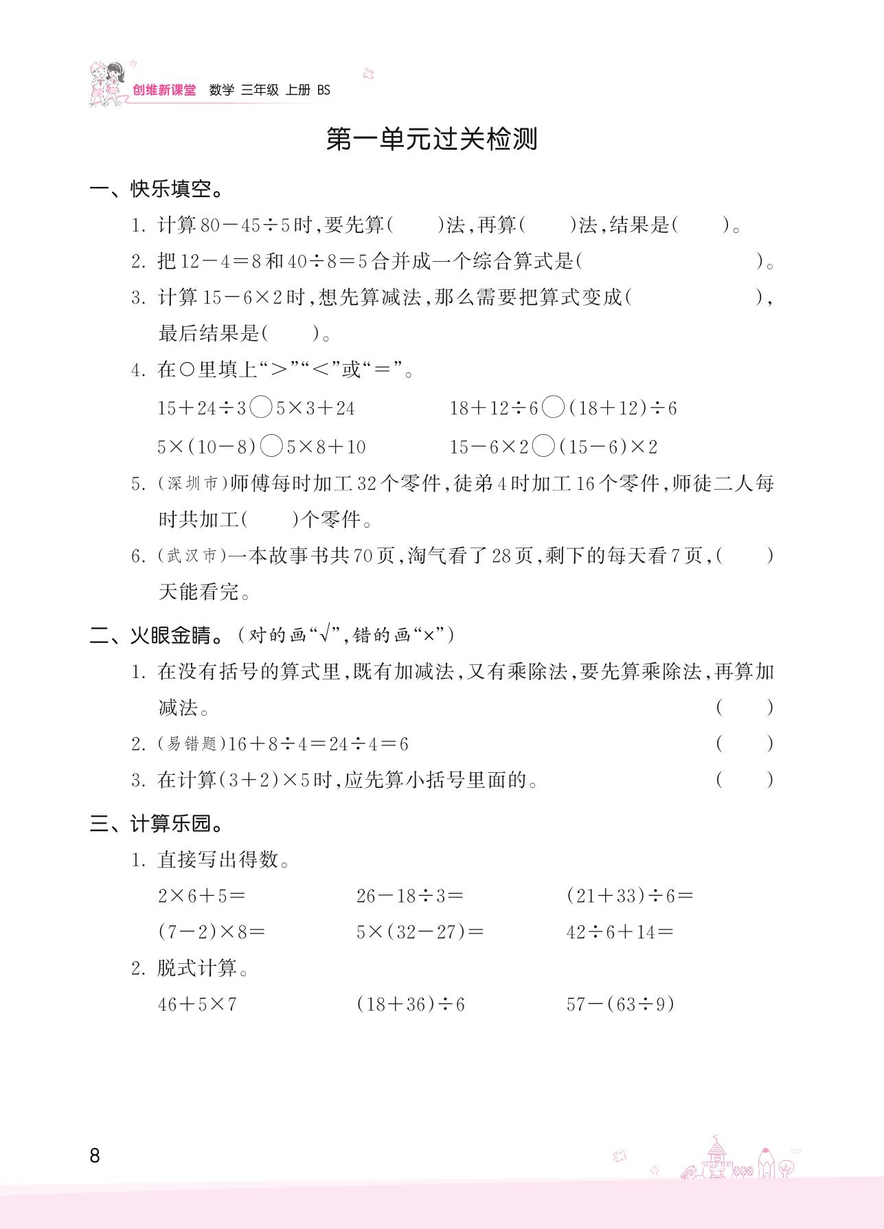 2022上册三年级数学北师版 一 混合运算——第一单元过关检测