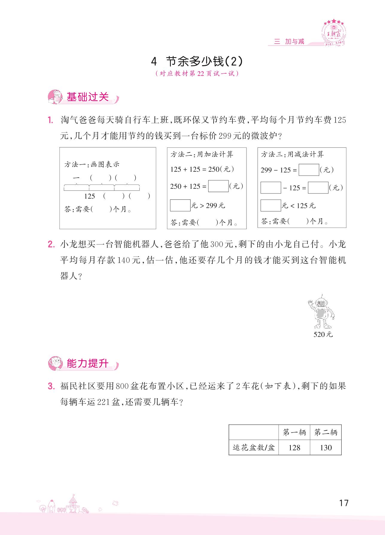 2022上册三年级数学北师版 三 加与减——4 节余多少钱(2)