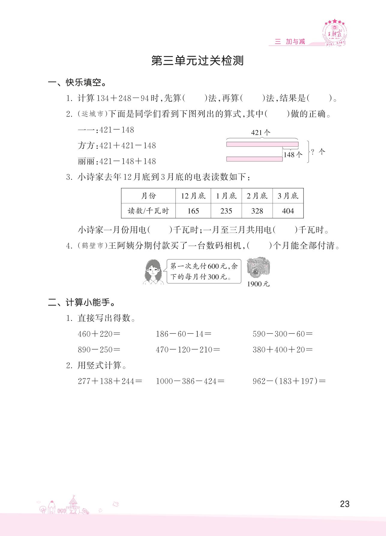 2022上册三年级数学北师版 三 加与减——第三单元过关检测