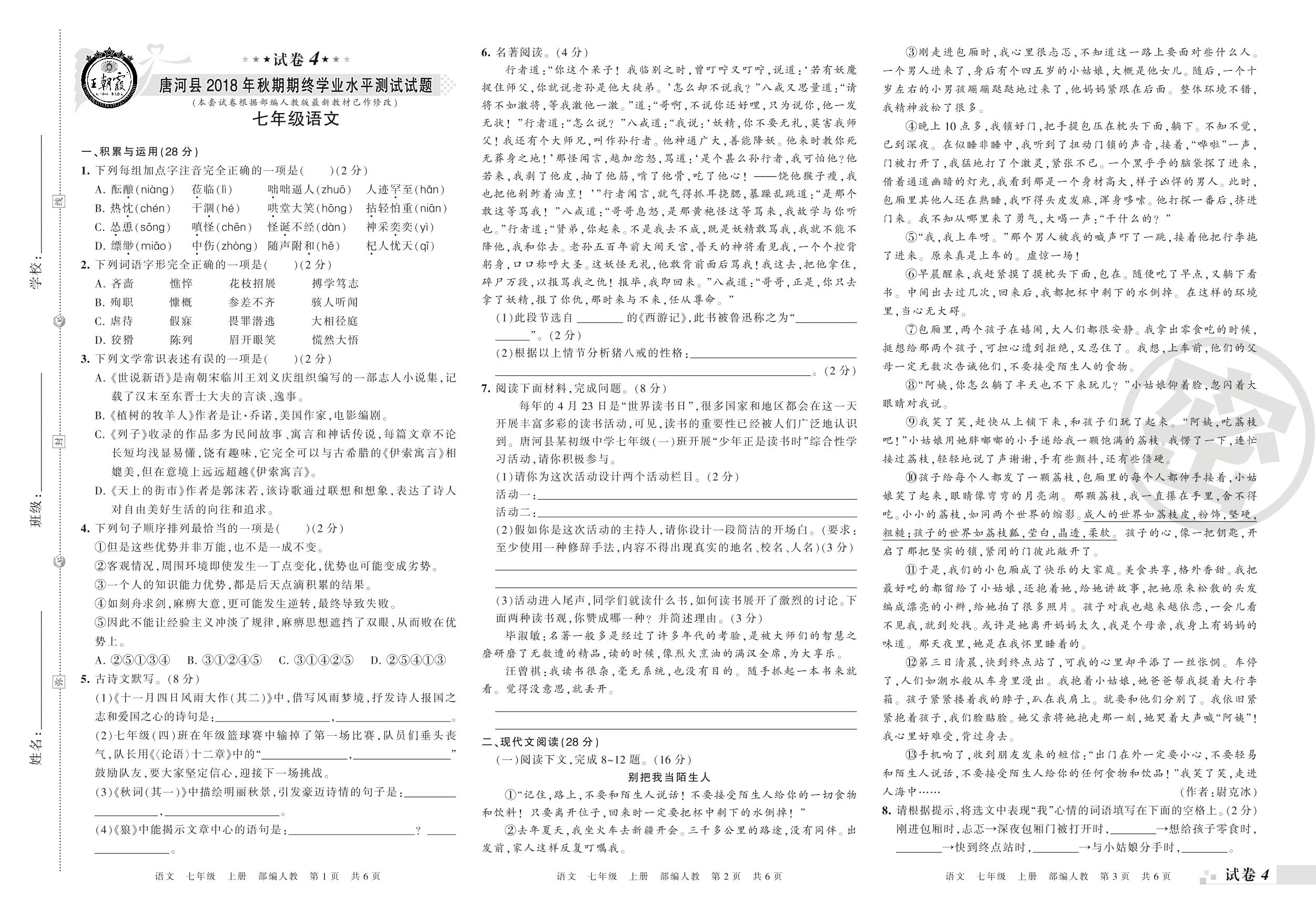 2018-2019学年第一学期南阳市唐河县七年级语文试卷(人教版)【4】