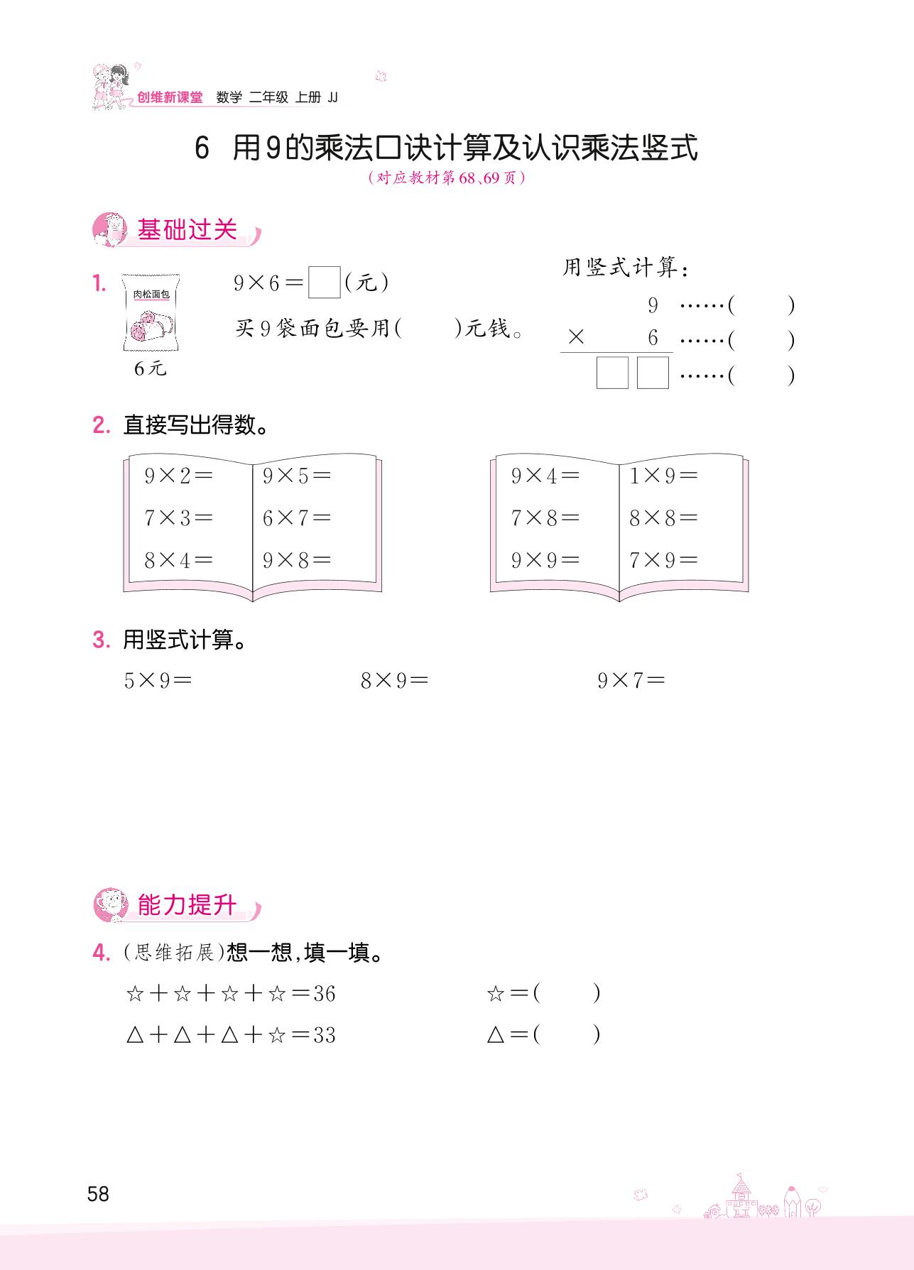 2022上册二年级数学冀教版 七 表内乘法和除法(二)——6 用9的乘法口诀计算及认识乘法竖式