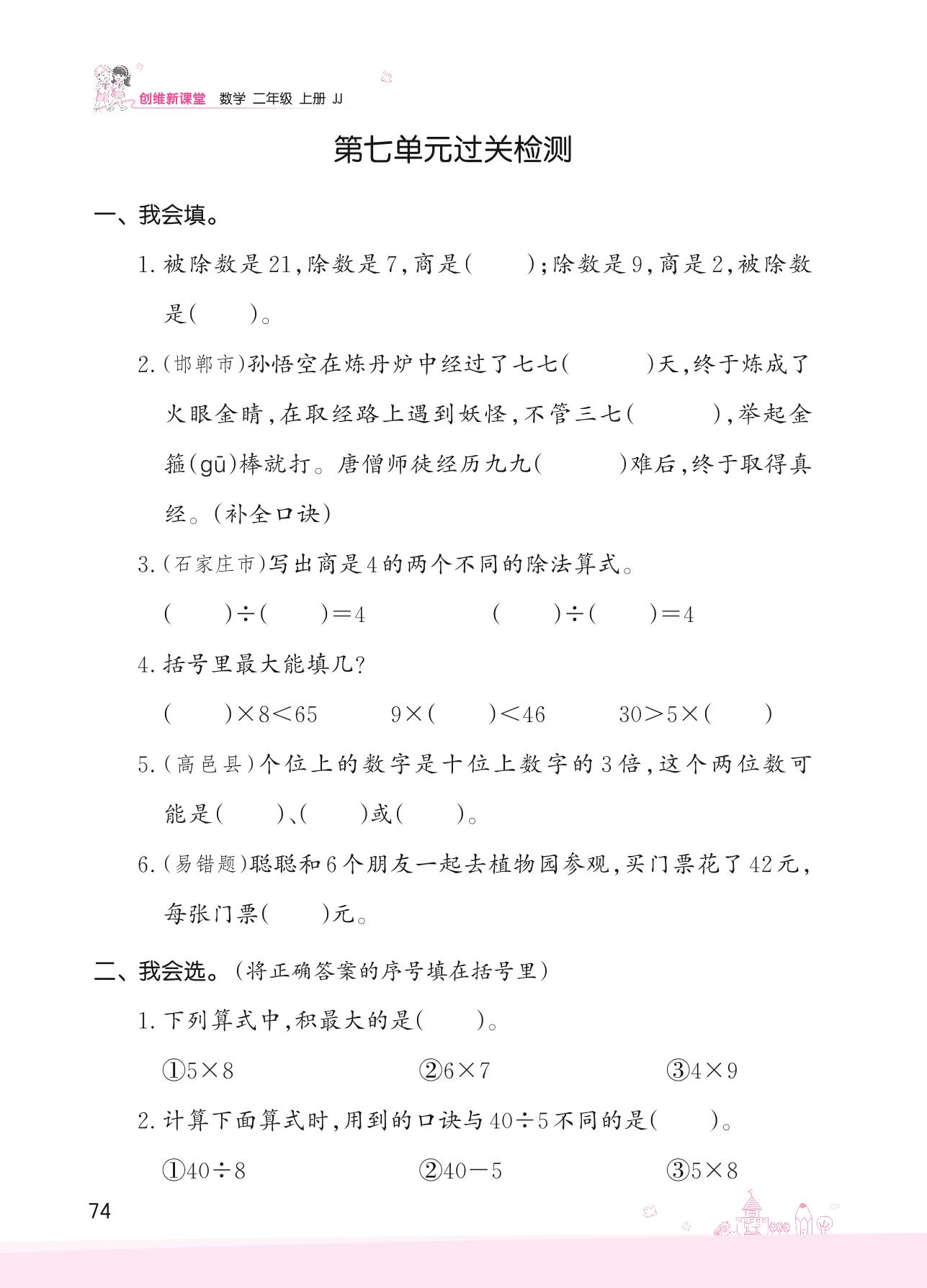 2022上册二年级数学冀教版 七 表内乘法和除法(二)——第七单元过关检测