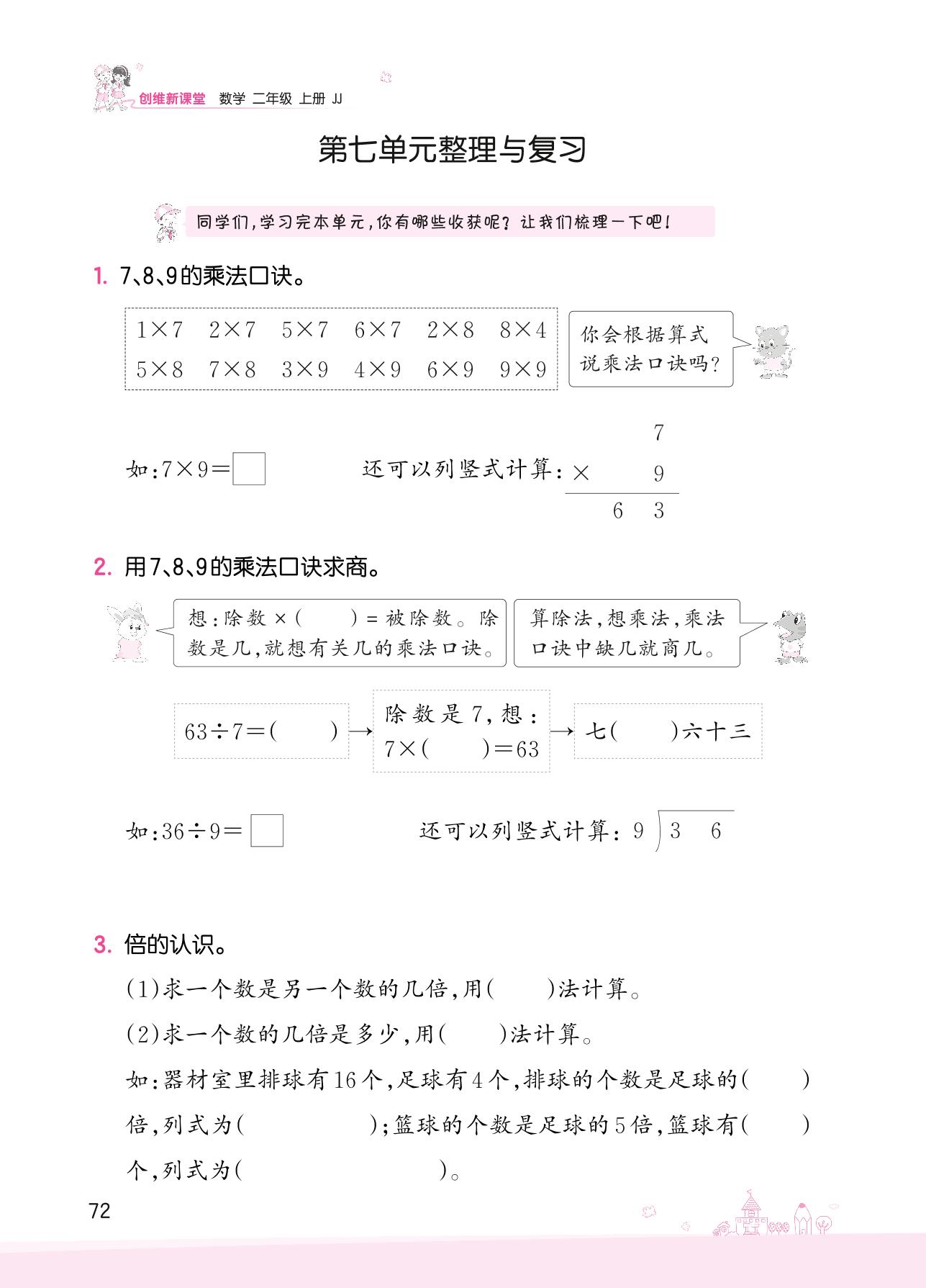 2022上册二年级数学冀教版 七 表内乘法和除法(二)——第七单元整理与复习