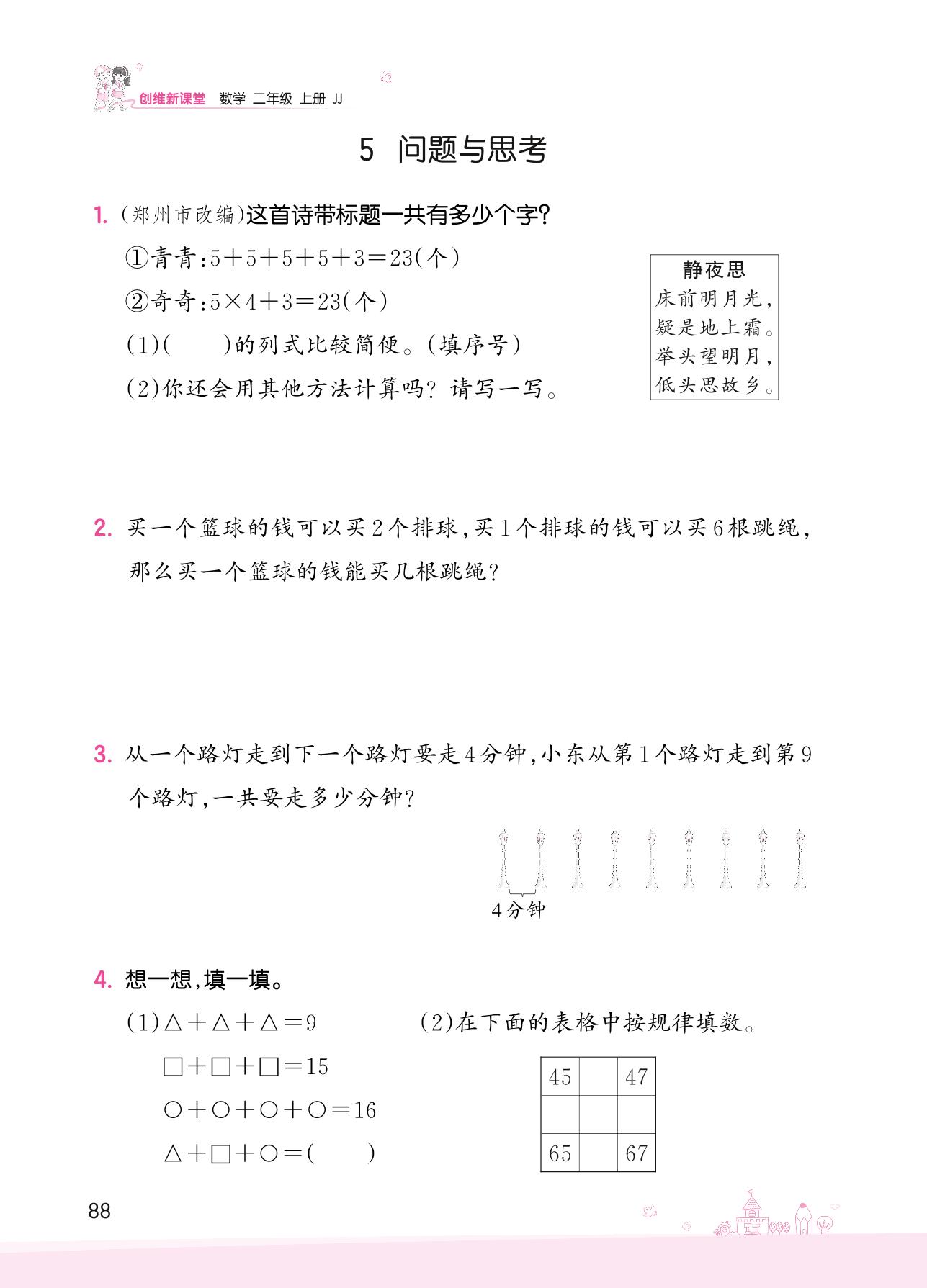 2022上册二年级数学冀教版 整理与评价——5 问题与思考