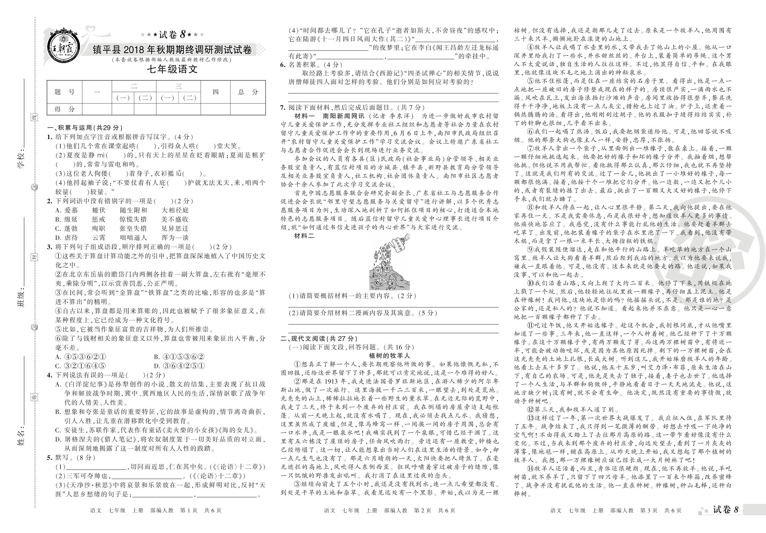 2018-2019学年第一学期南阳市镇平县七年级语文试卷(人教版)【8】
