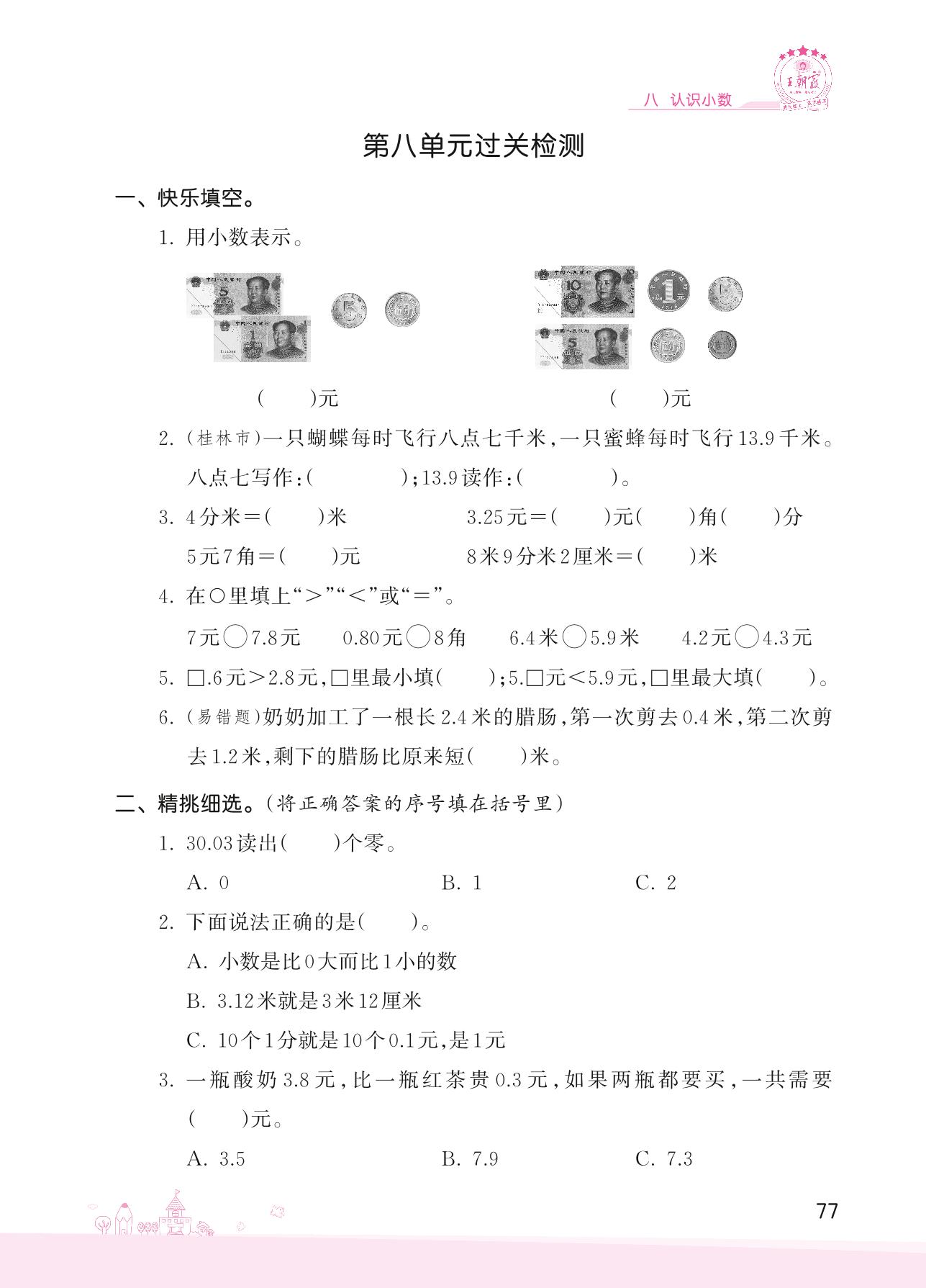 2022上册三年级数学北师版 八 认识小数——第八单元过关检测