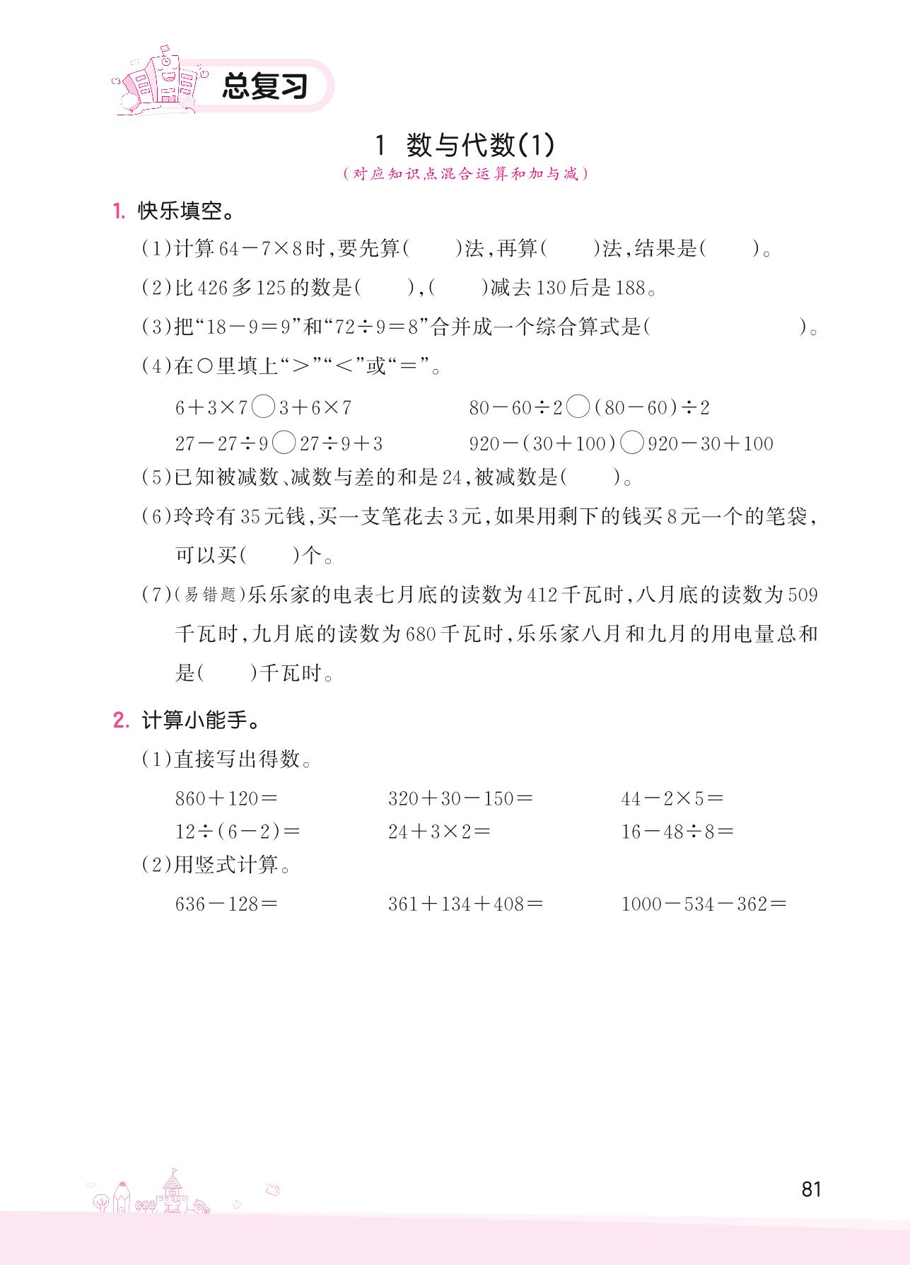 2022上册三年级数学北师版 总复习——1 数与代数(1)