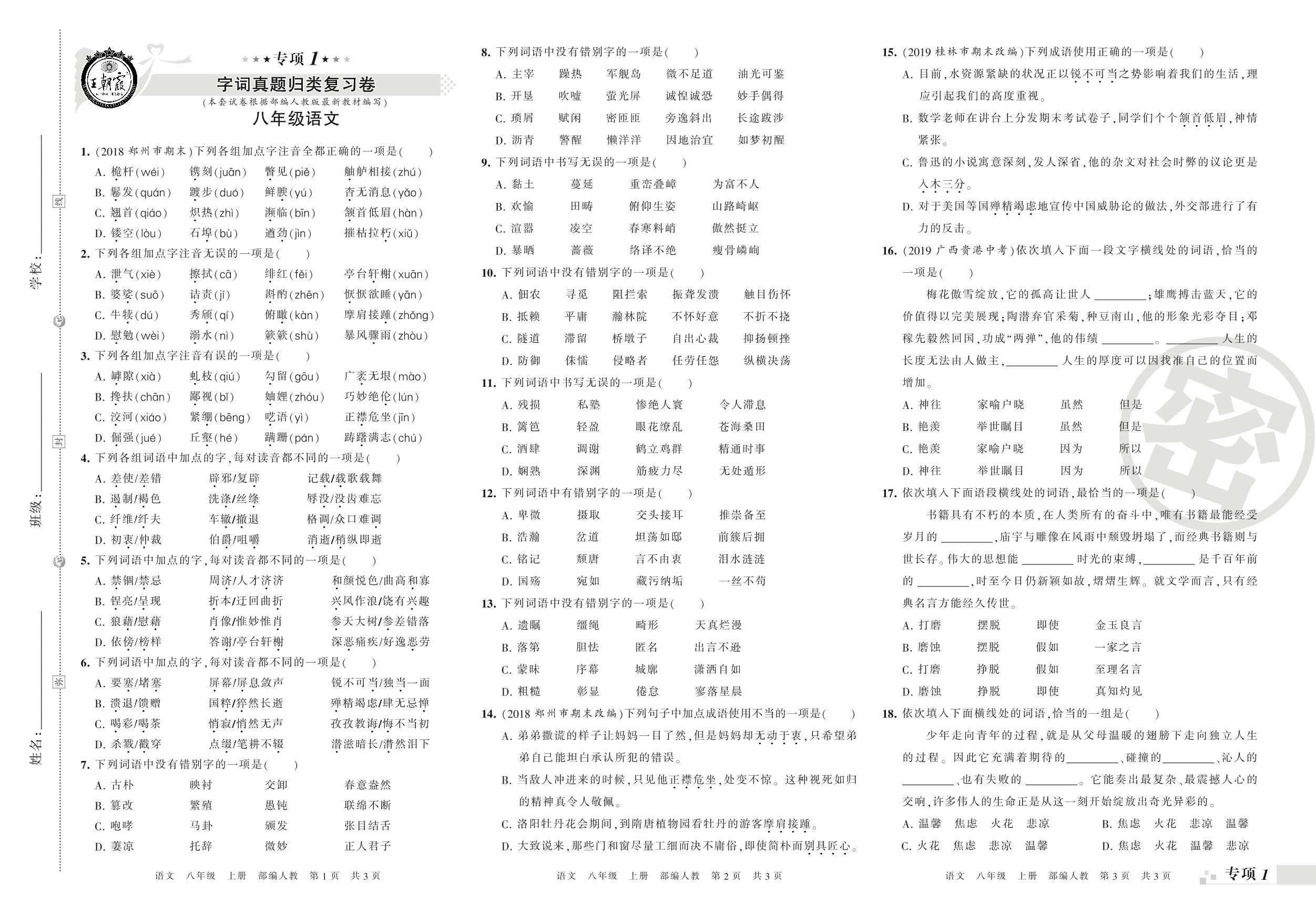 王朝霞期末专项卷——字词、句子真题归类复习八年级上册语文(人教版)_R21080232518【0】