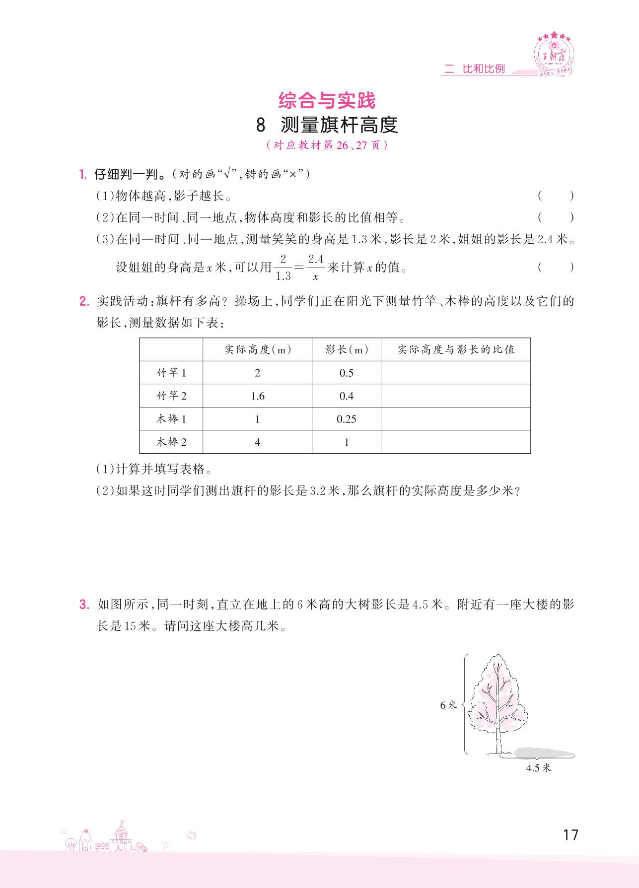 2022上册六年级数学冀教版 二 比和比例——8 测量旗杆高度