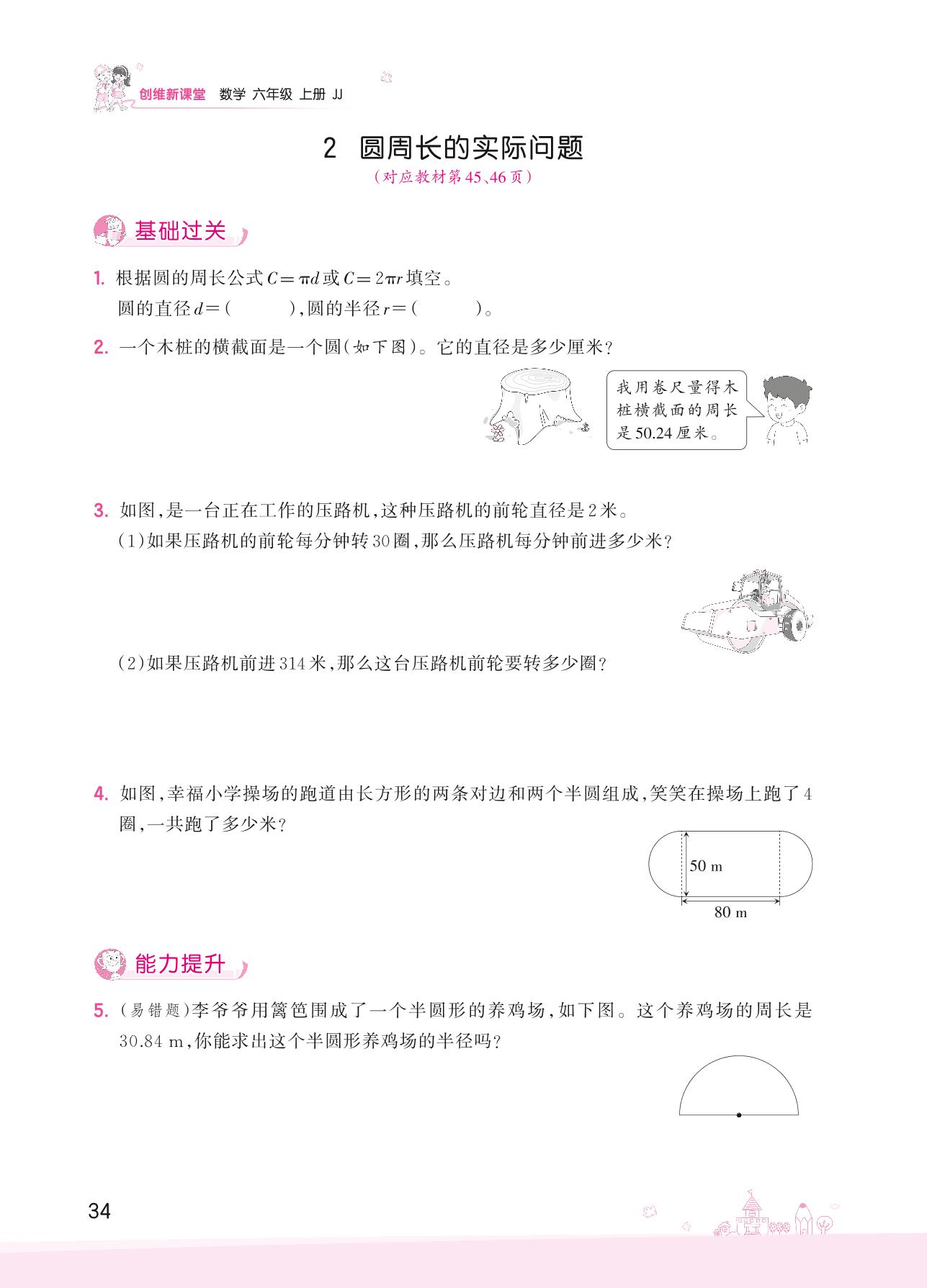 2022上册六年级数学冀教版 四 圆的周长和面积——2 圆周长的实际问题