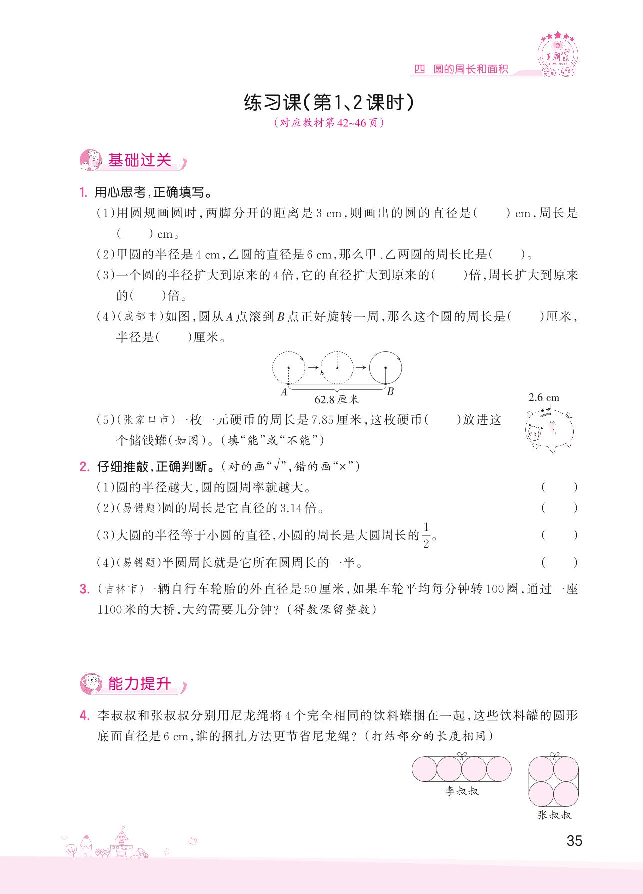2022上册六年级数学冀教版 四 圆的周长和面积——练习课(第1、2课时)