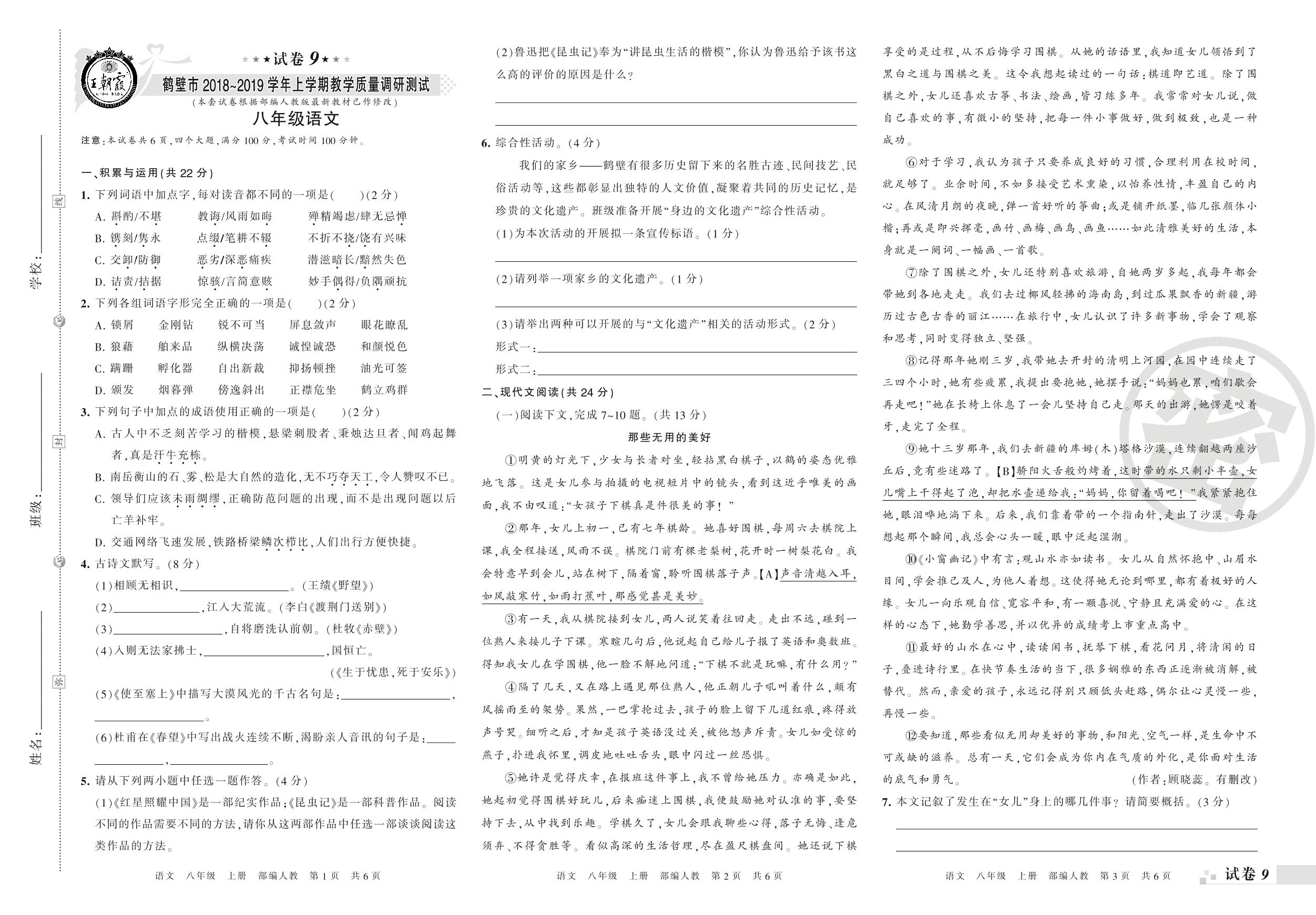 2018-2019学年第一学期鹤壁市八年级语文试卷(人教版)【9】