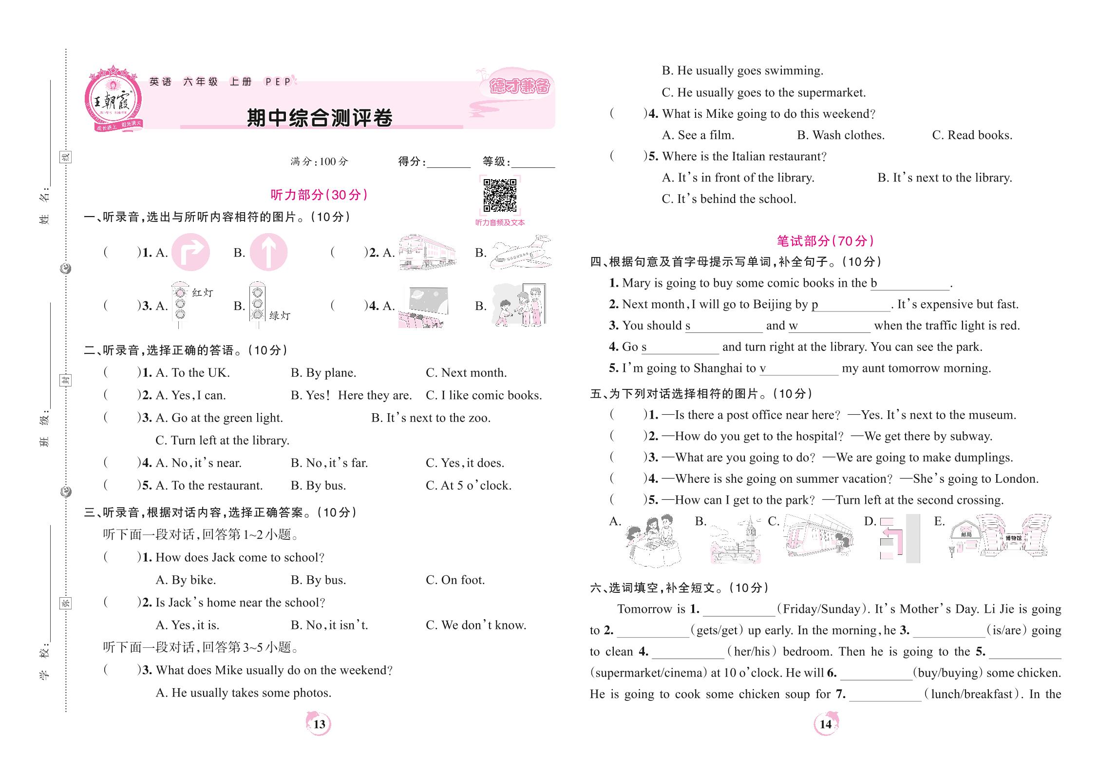 2022上册六年级英语人教PEP版 期中综合测评卷